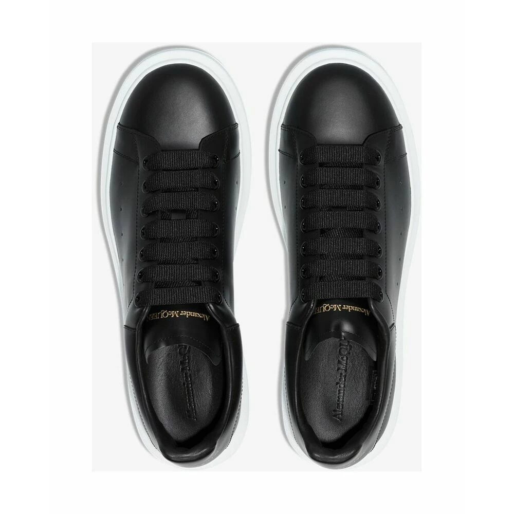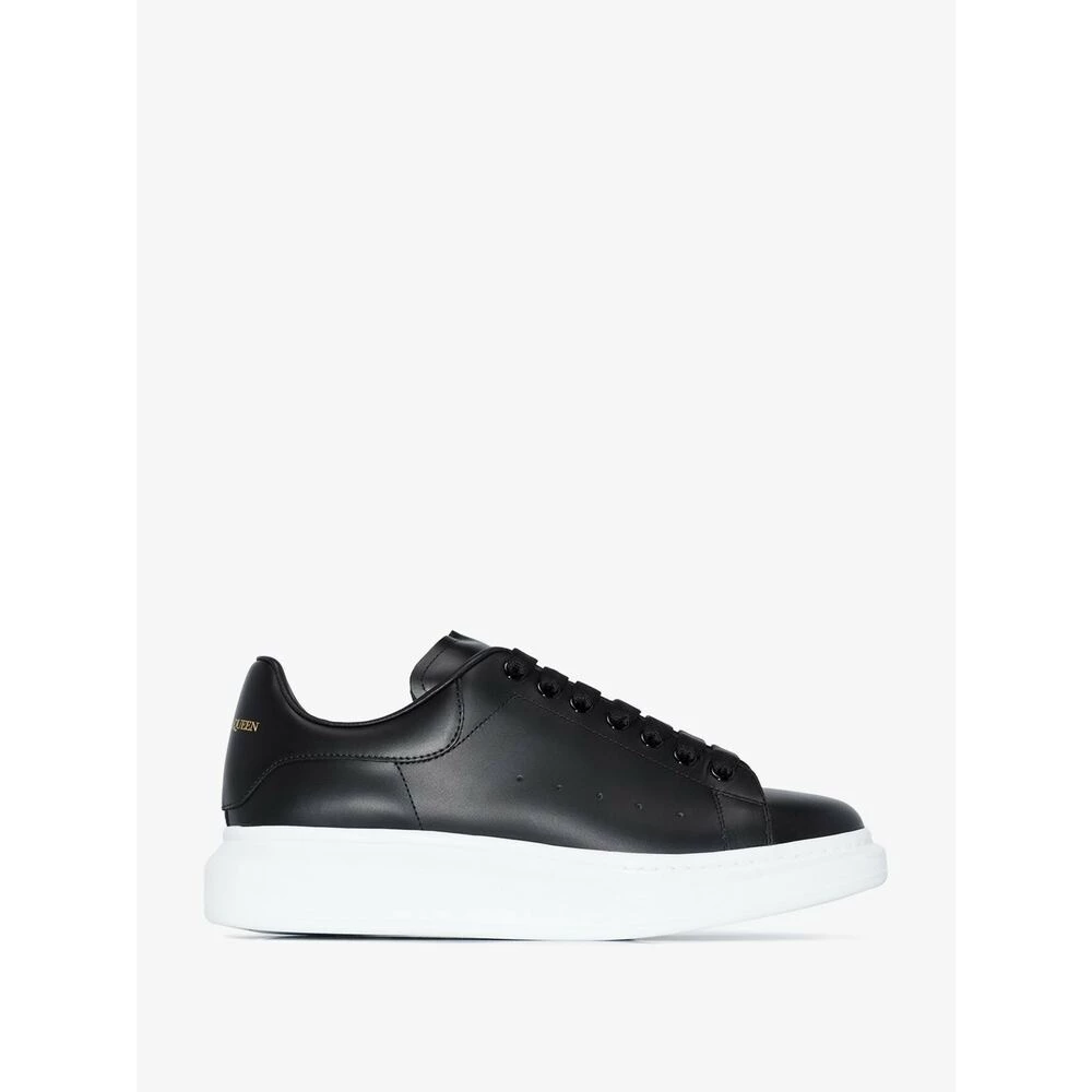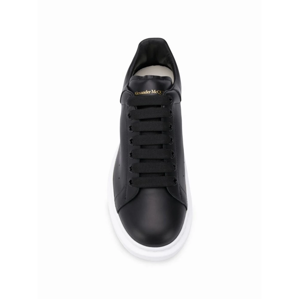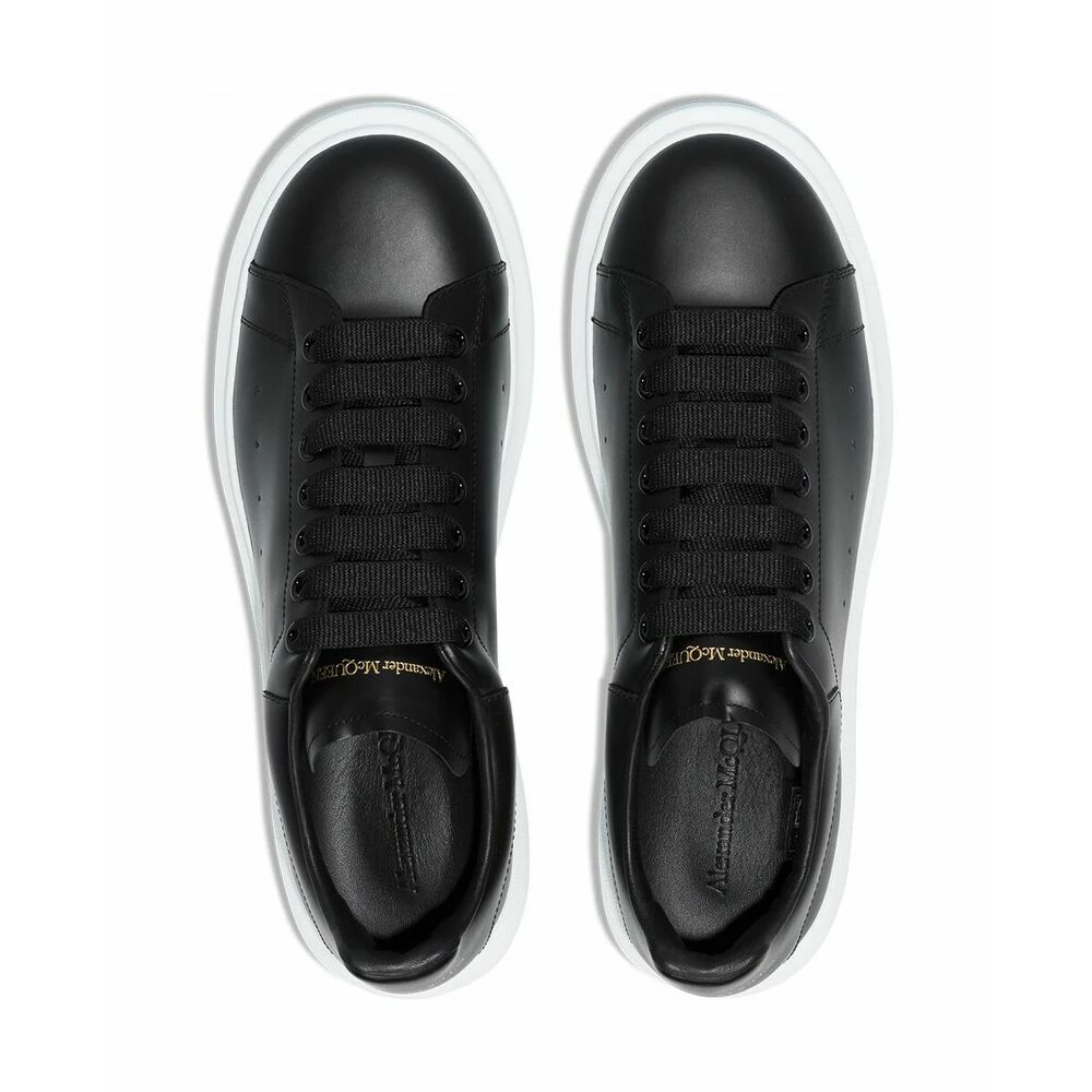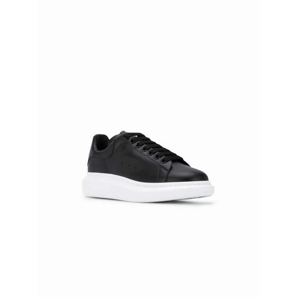 Alexander McQueen svarte joggesko. Disse Alexander McQueen-sneakersene er den ideelle godbiten for føttene dine, og tar utseendet et skritt videre med sin forhøyede overdimensjonerte gummisåle. Med snøring foran, en rund tå, en merkepreget pløs og en overdimensjonert gummisåle.
