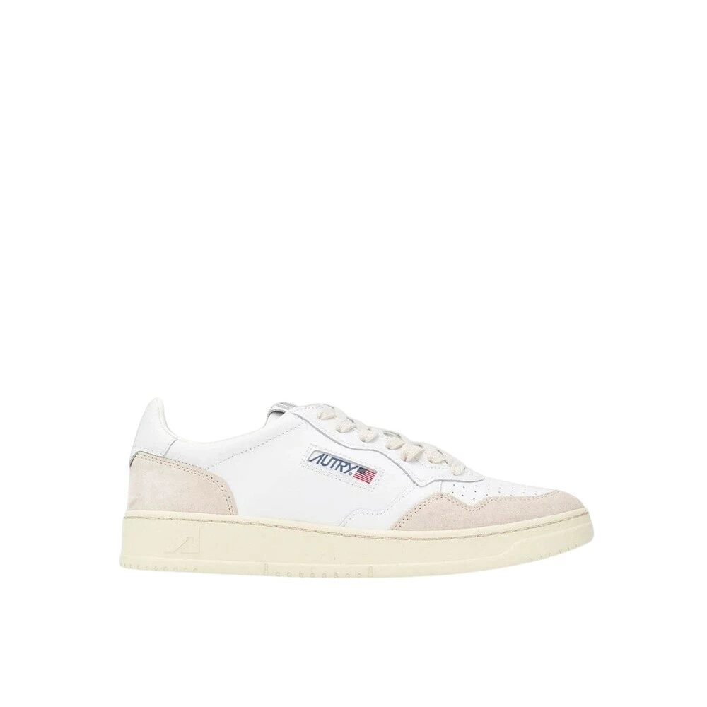 Autry joggesko hvite aulm ls33 hvite joggesko av autry i skinn med perforert rund tå, hvit hældetaljer, semsket skinn, stenging med flat bomullssnører, sidelogo og flat gummisåle.