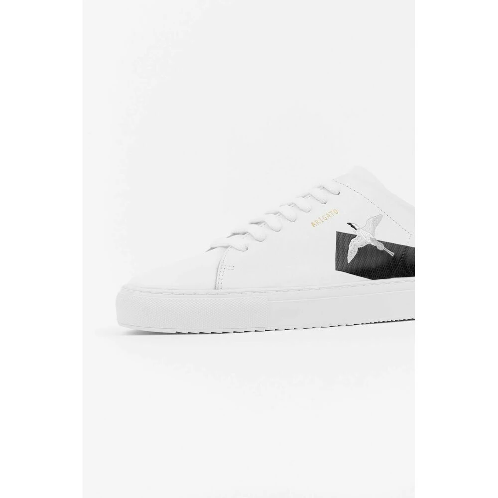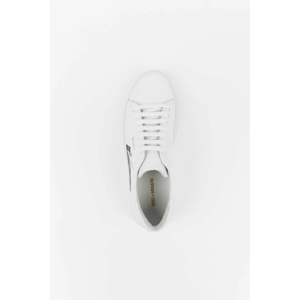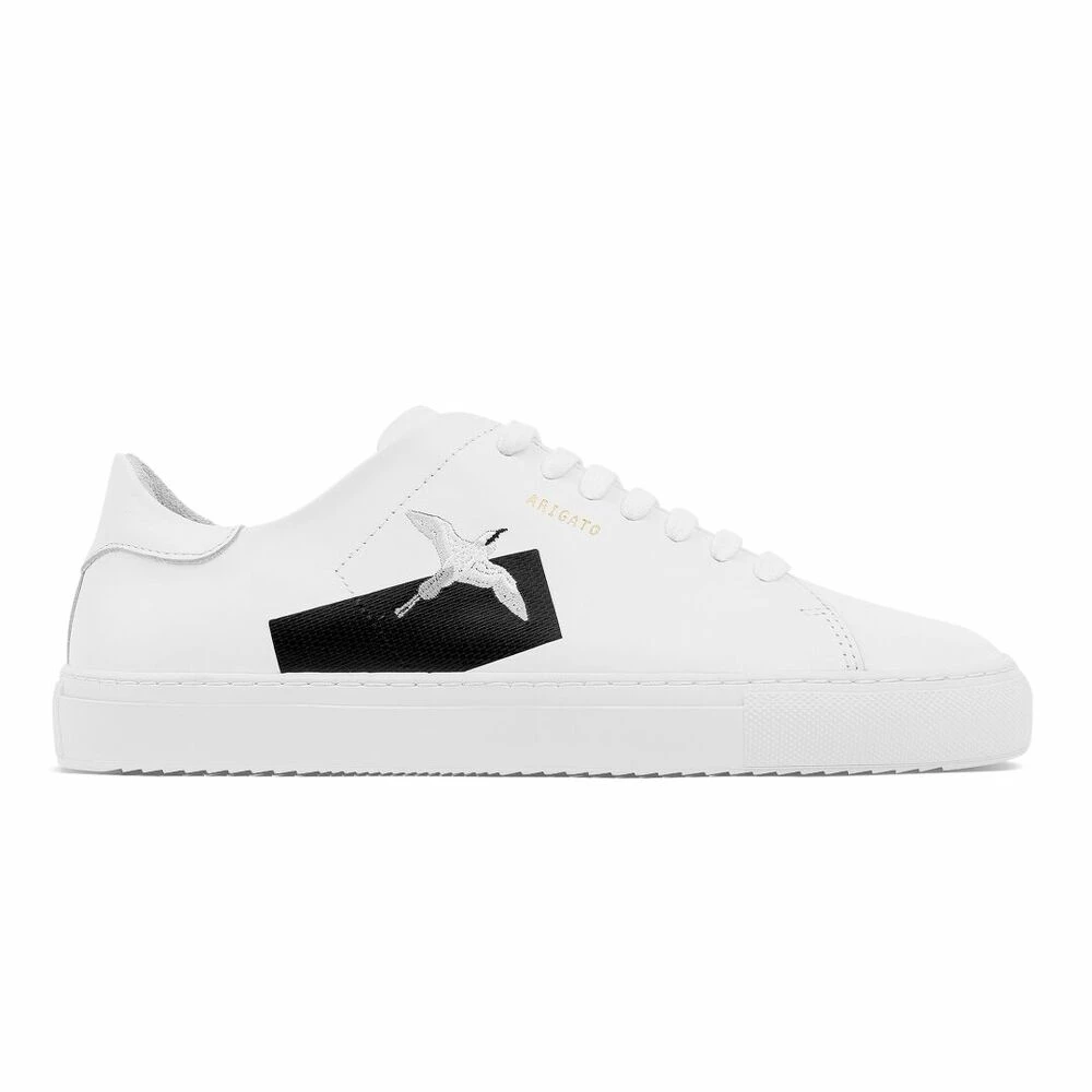 Hvite Axel Arigato Clean 90 joggesko med lav topp med &;Tape Bird&;-broderi på sidene, snøring, gulltonet metalllogo på siden, rund tå, slitesterk sydd og limt såle, avtagbar, polstret fotseng. Håndlaget.