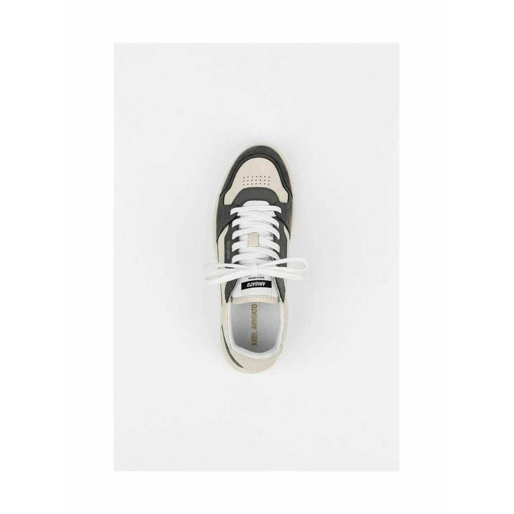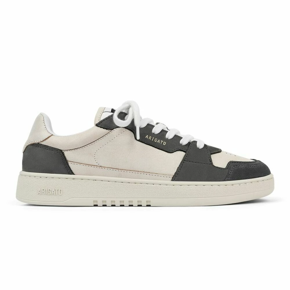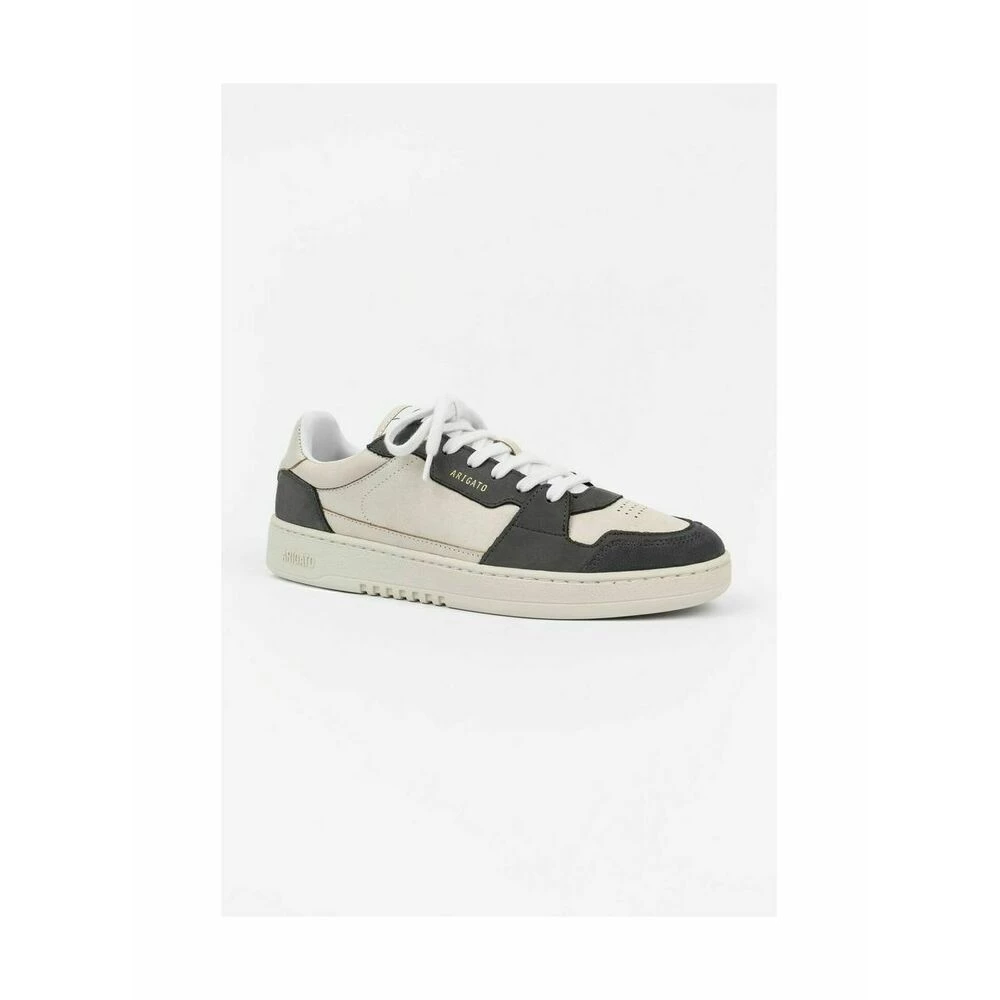 Hvite og grå Axel Arigato Dice Lo lave sneakers med vintage-inspirert design med slitt effekt. Overdelen er laget av nubuck og italiensk skinn. Teksturert merket gummisåle. Fôr er laget av resirkulert polyester. Snøring. Gulltonet metallisk logo på siden. Perforert på tå.