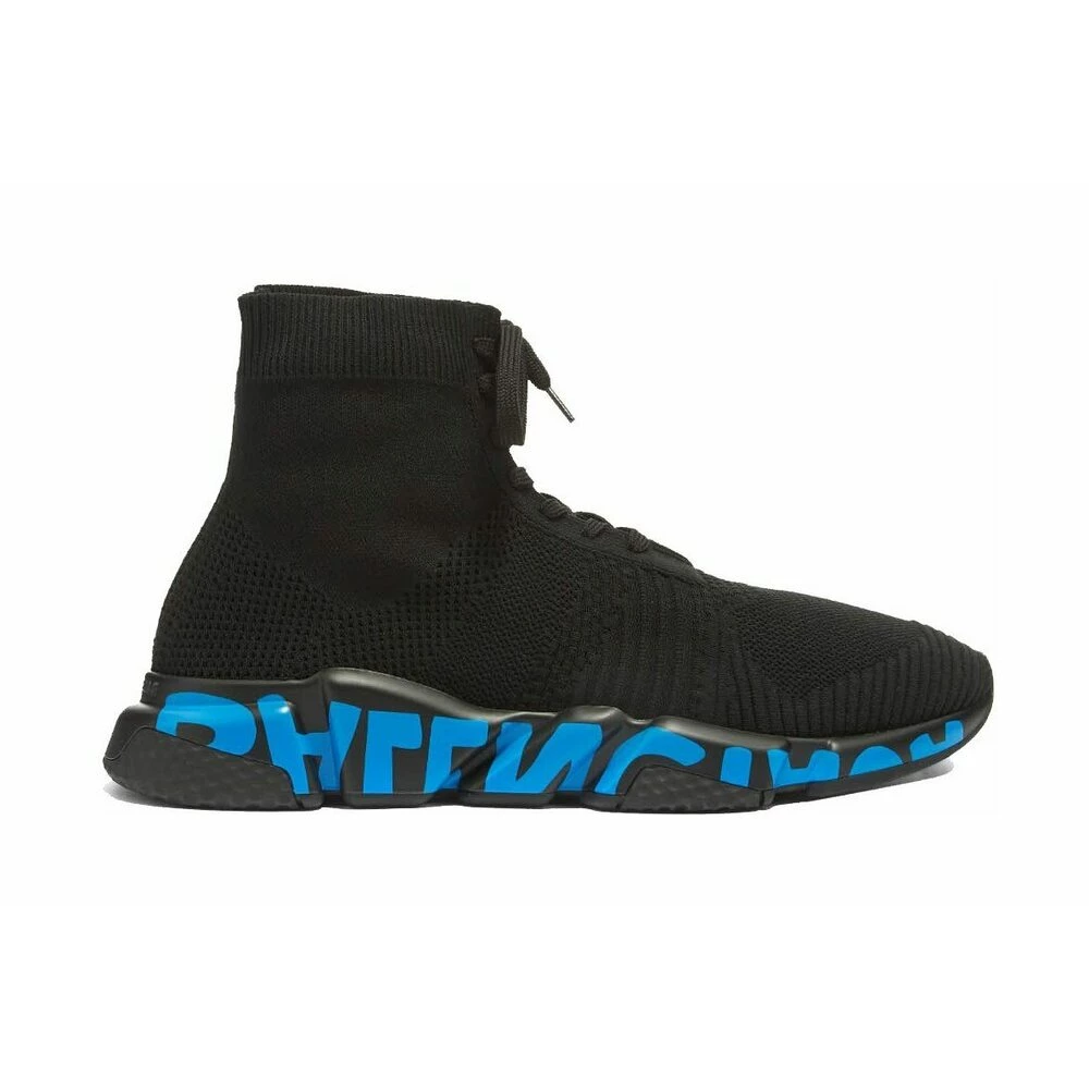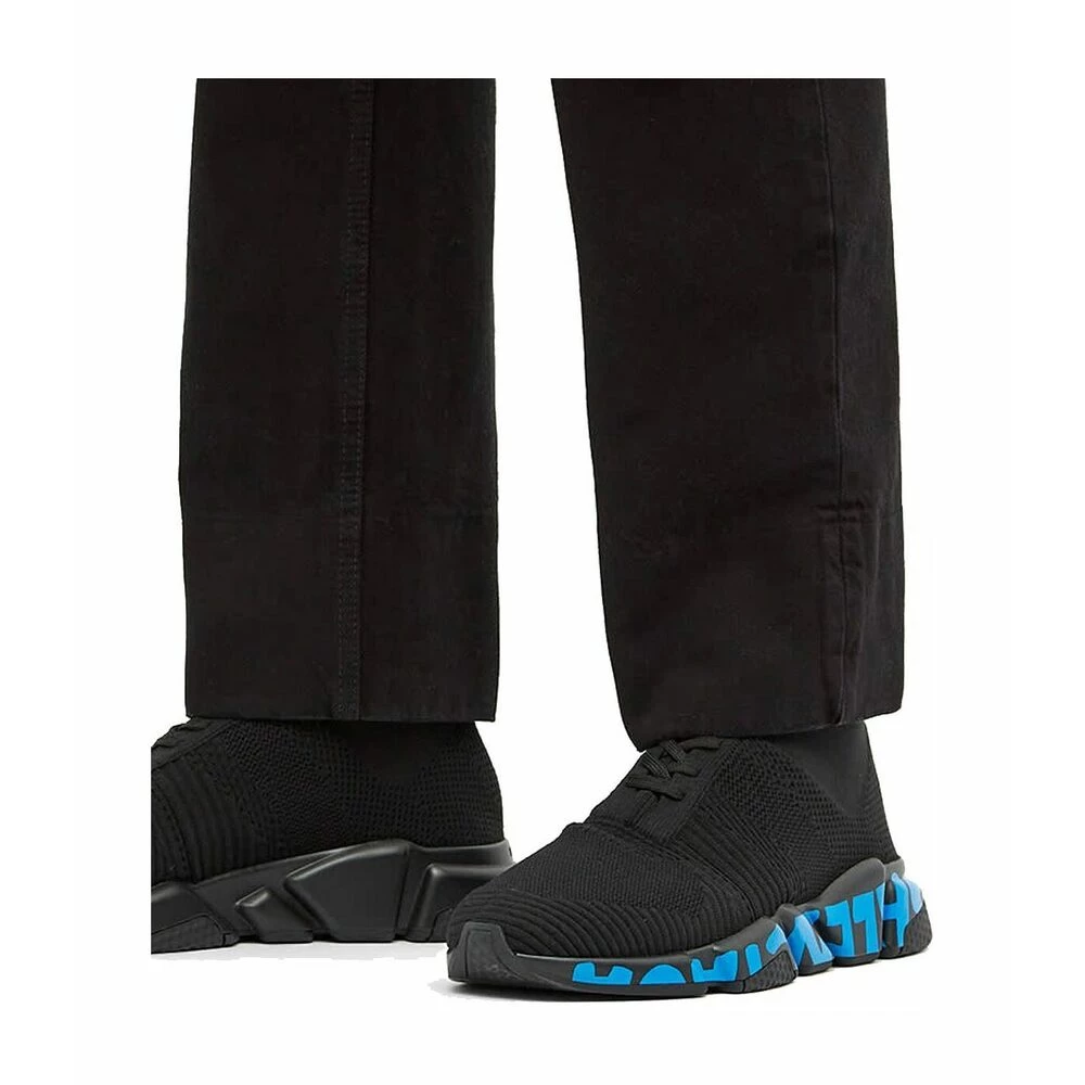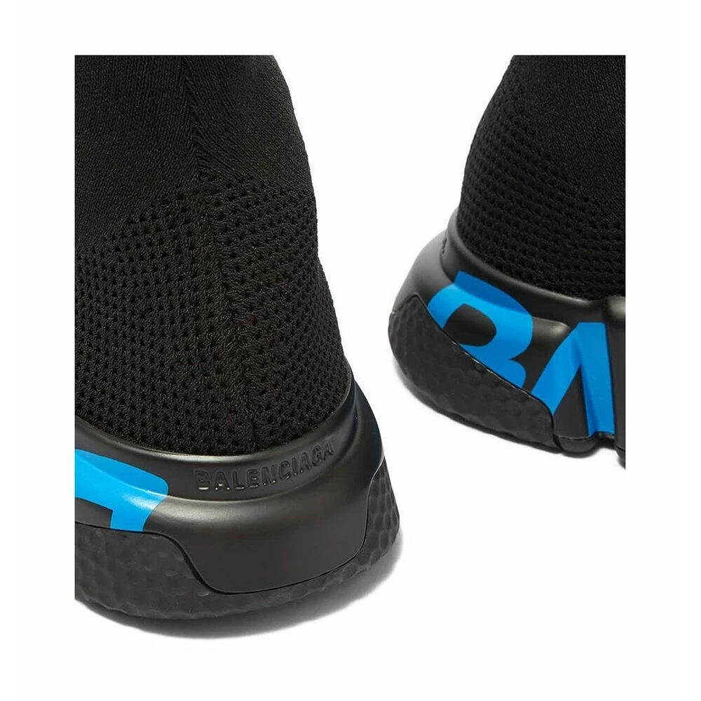 Balenciaga Laced Speed Runner holder sine ikoniske sokklignende overdel og ergonomiske såler, og bytter ut sin vanlige tekstilkonstruksjon for teknisk 3D-strikk, og legger til snøringsfarge: svart/blå strikk overdel sokklignende konstruksjon trykt merkevarebygging gummi yttersåle i Italia