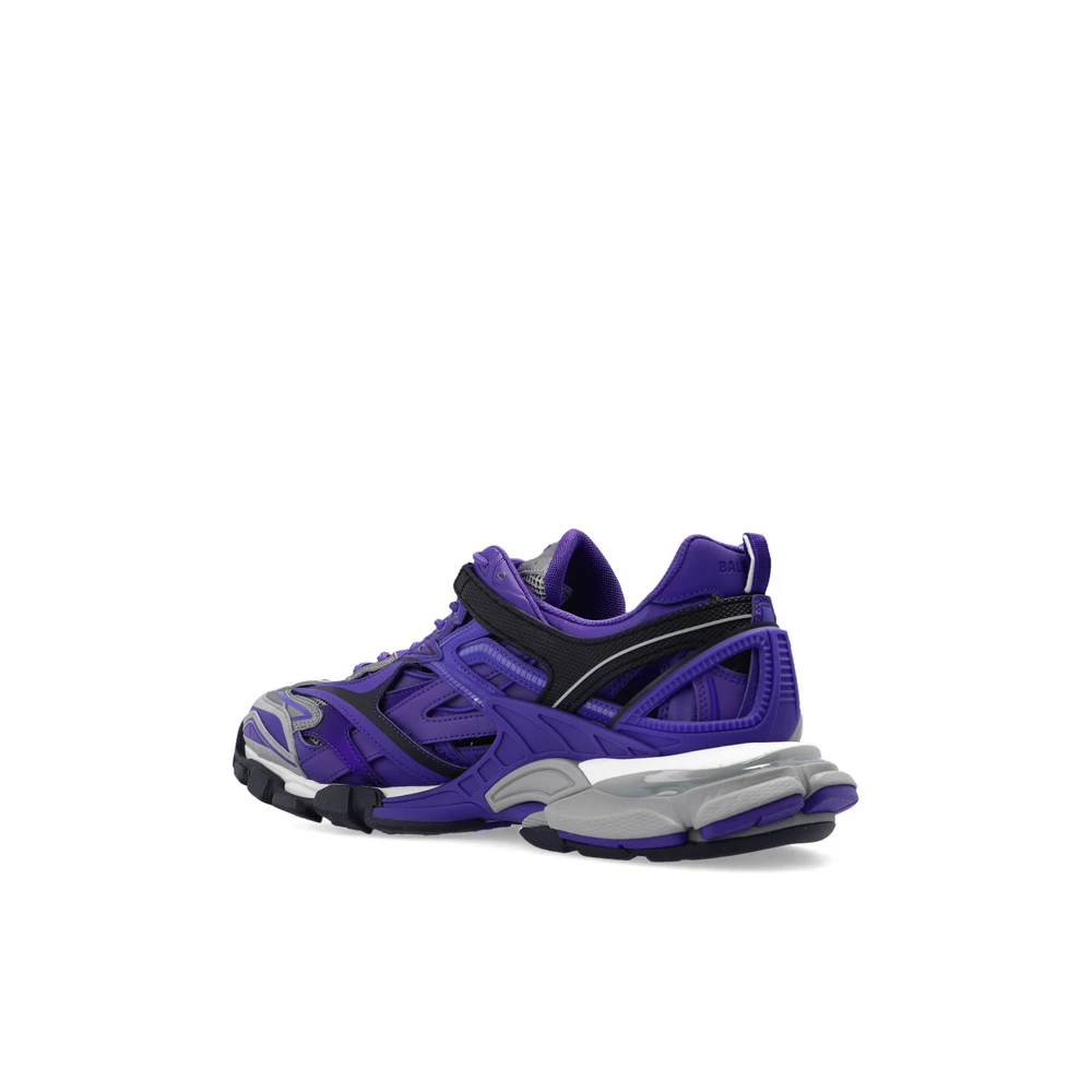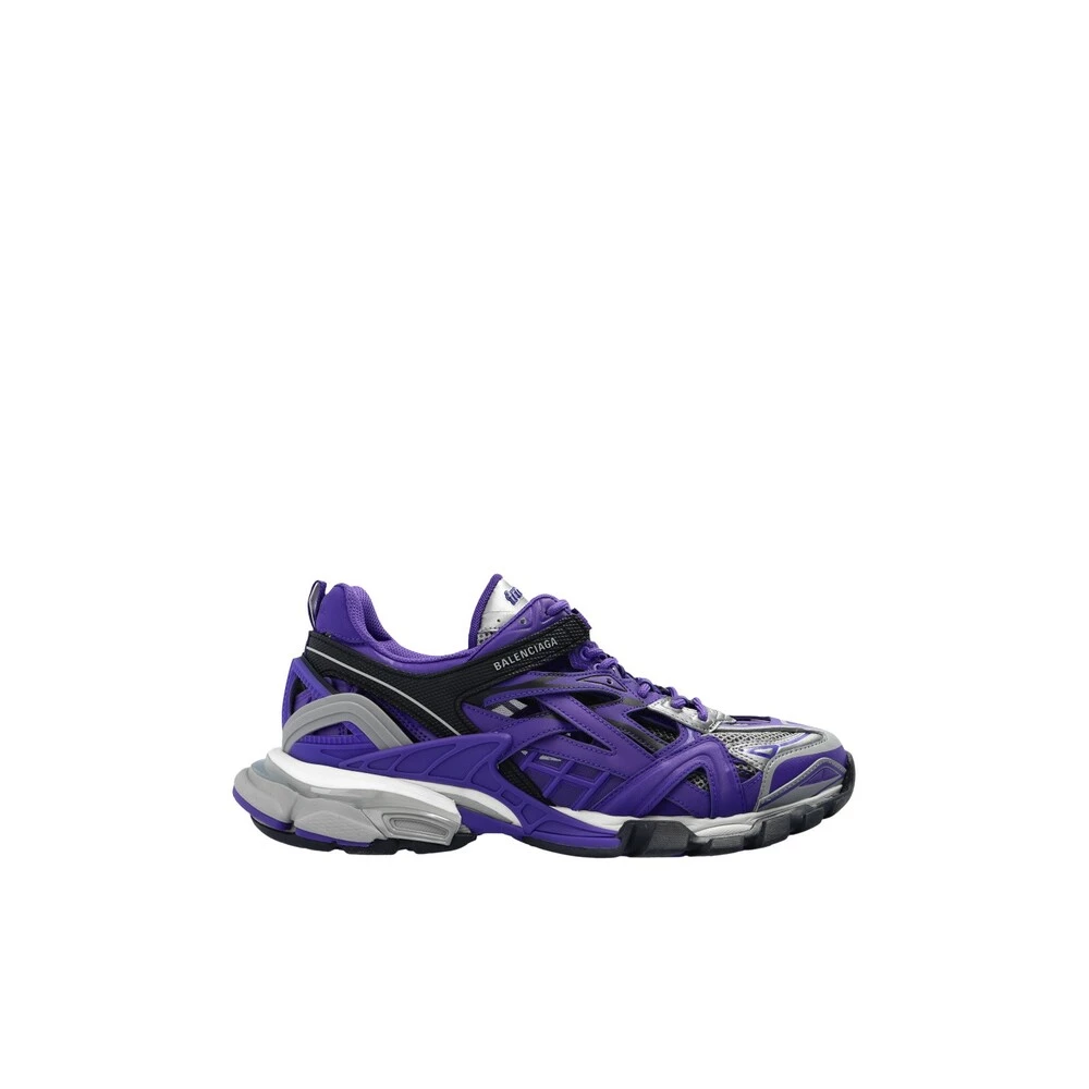 Lilla og grå ‘spor 2’ joggesko fra Balenciaga. Denne snøremodellen er trykt med merkets logo i grått, og sitter på en lilla og grå gummisåle.