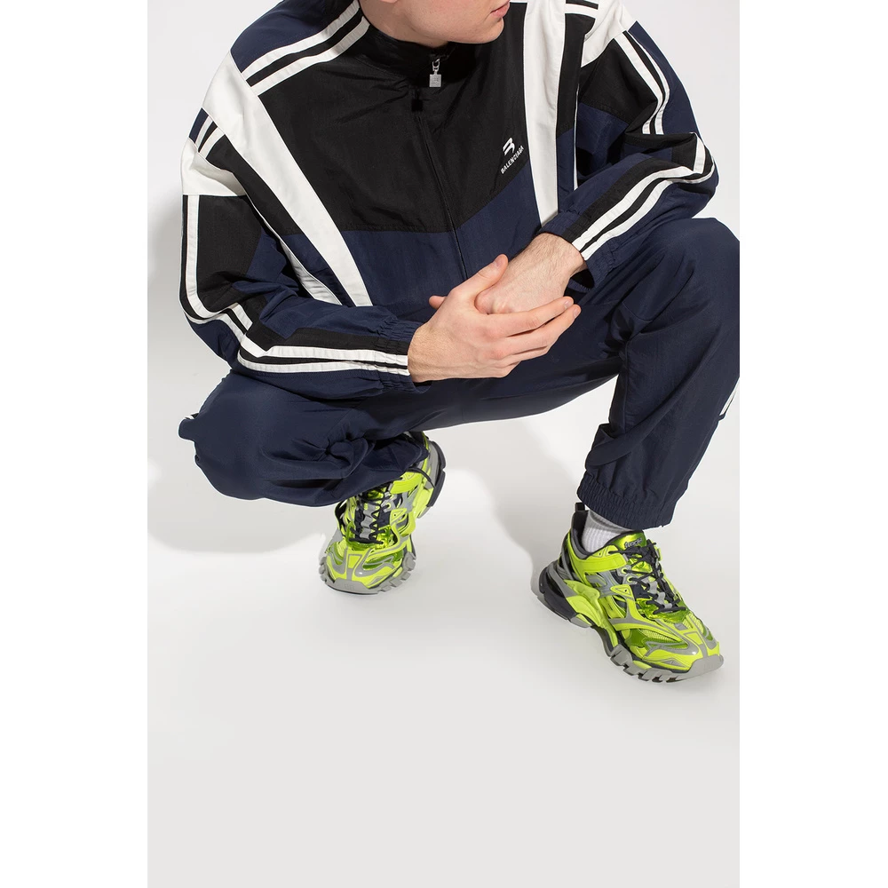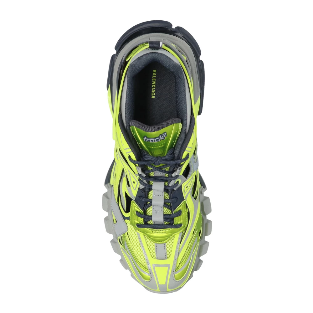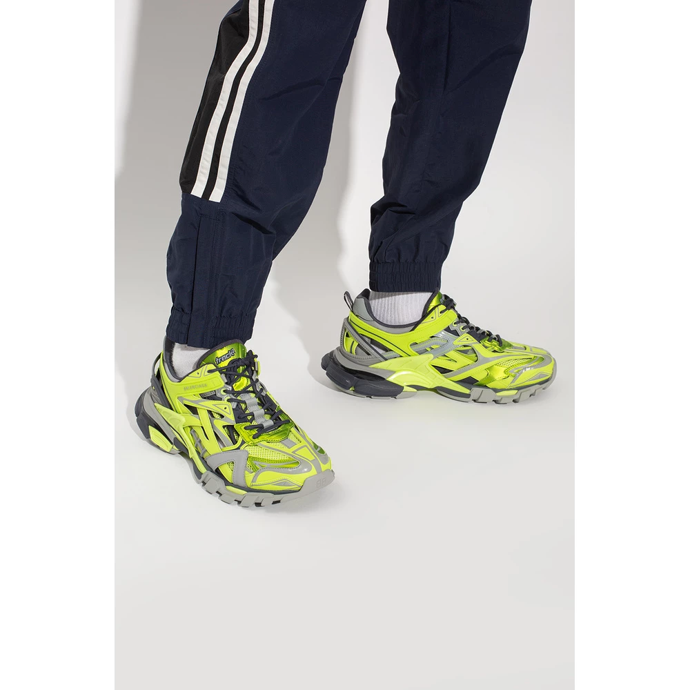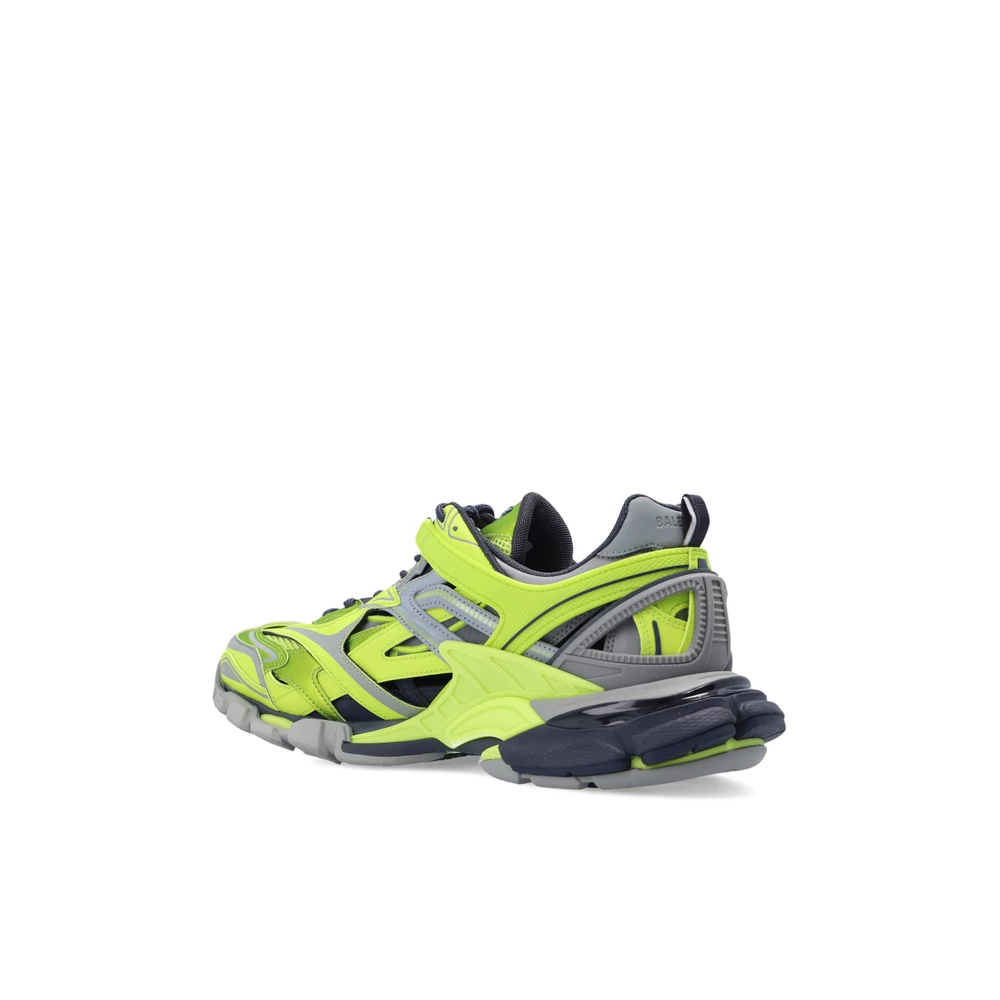 Green and Grey ‘Track 2’ joggesko fra Balenciaga. Denne blondermodellen er laget med neonfarger og har en grå logo-trykk, faux-skjærende trimmer og en grønn og grå gummisåle.