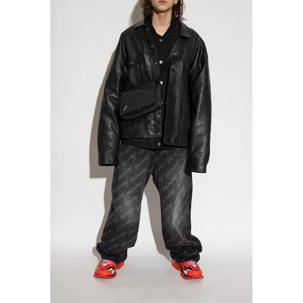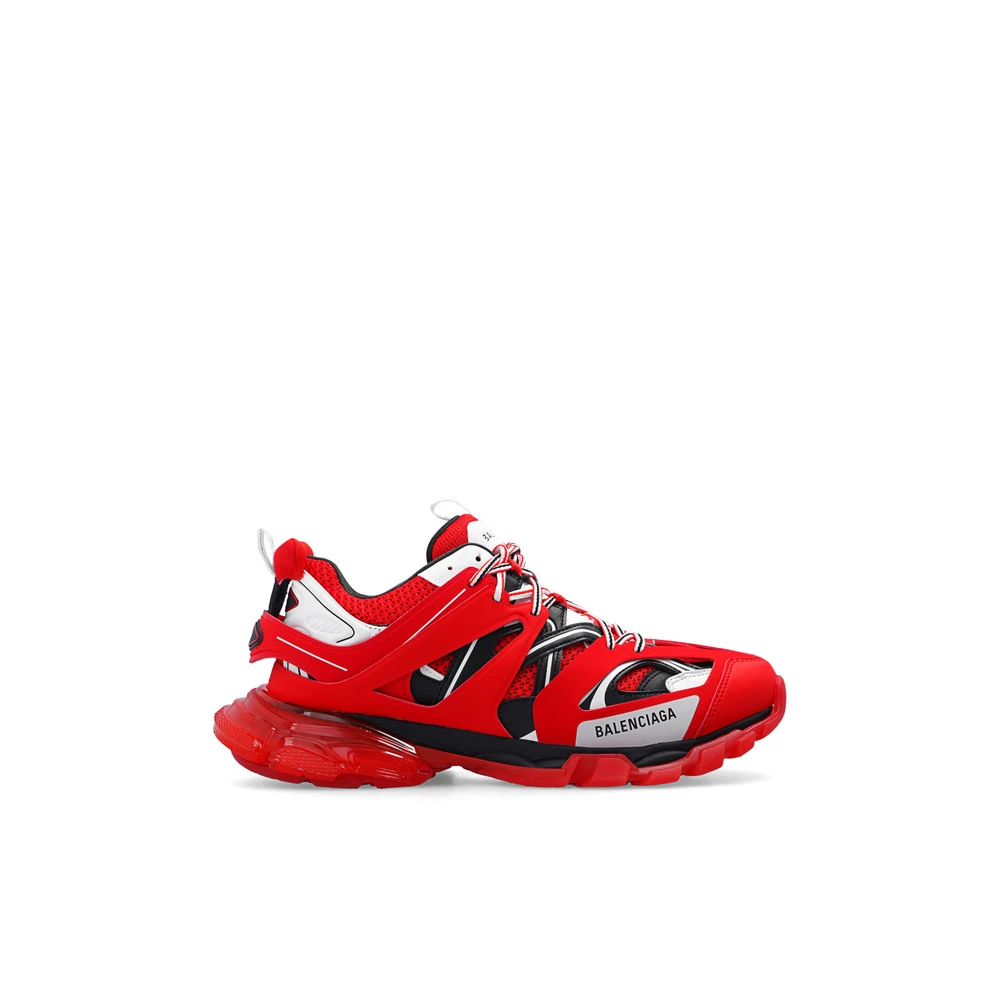 Røde, svart -hvite ‘spor’ joggesko fra Balenciaga. Dette blonderparet er laget av strukturert faux skinn, og har et svart logo-trykk og rød gummisåle.