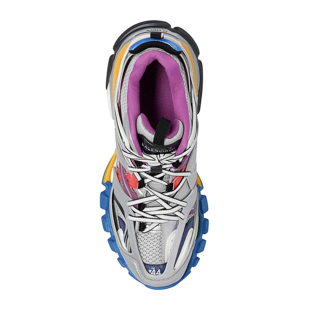 Flerfargede ‘spor’ joggesko fra Balenciaga. Dette blonderparet hviler på en flerfarget gummisåle, og har et nett og faux skinn øvre, logotrykk, preget mønster på tungen og størrelsesbroderiet foran.