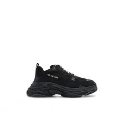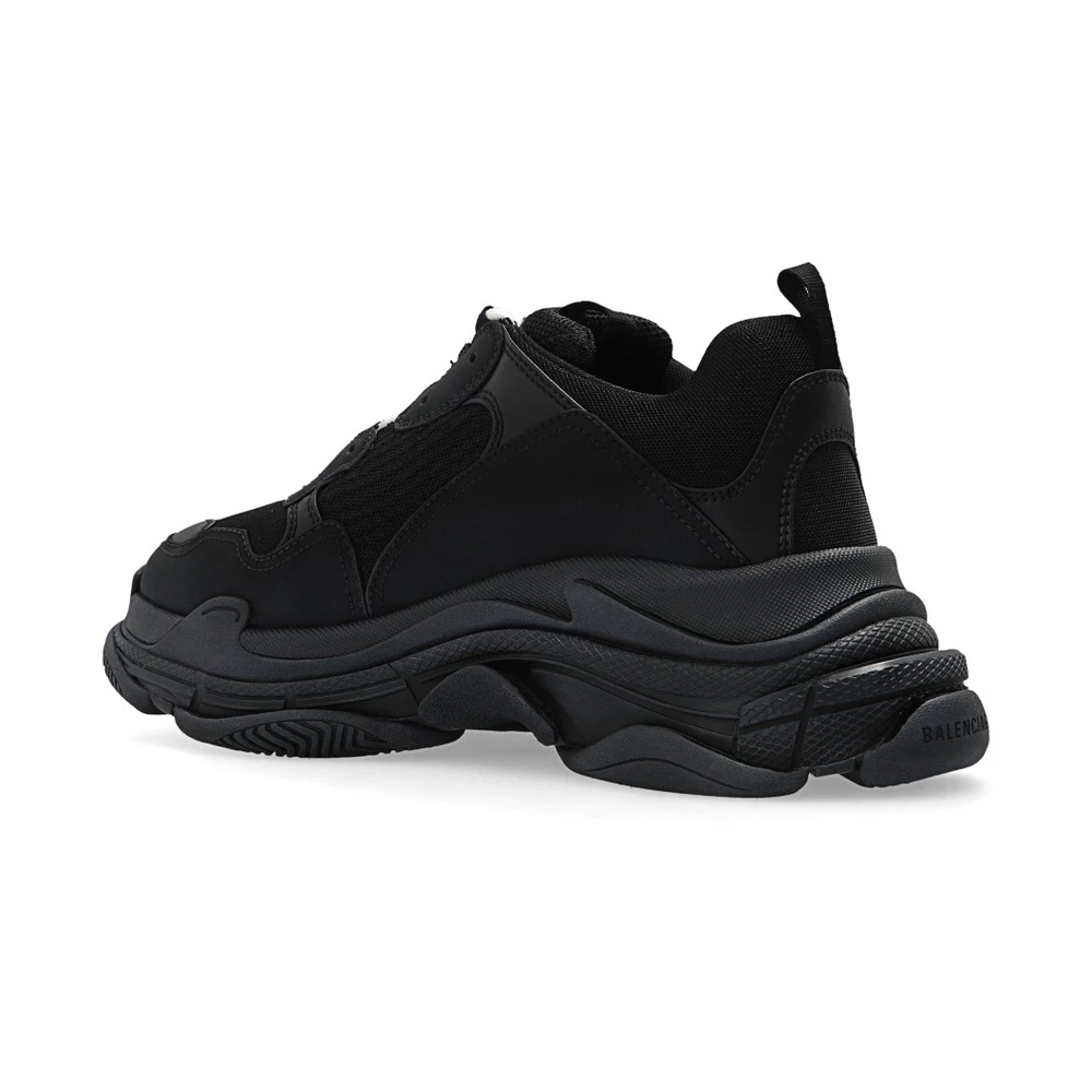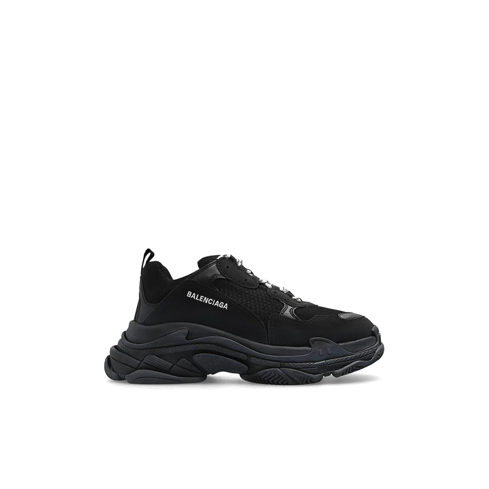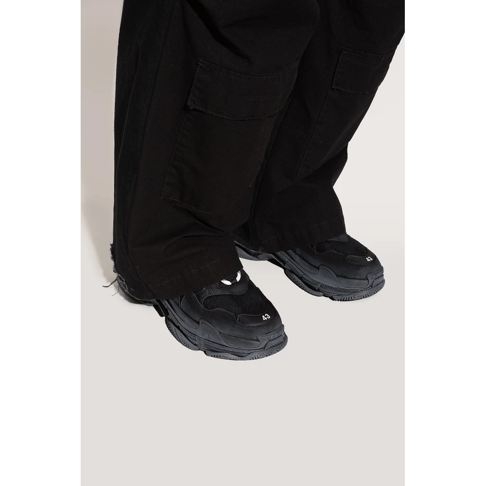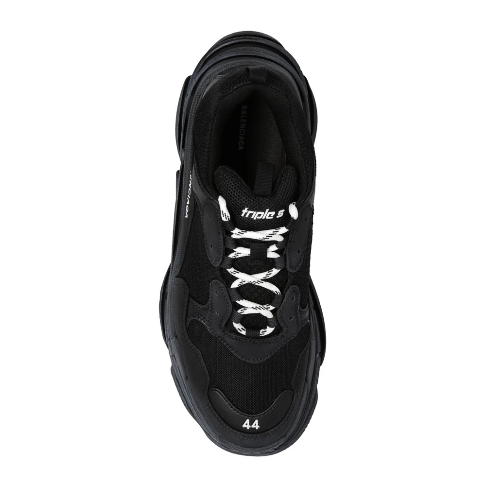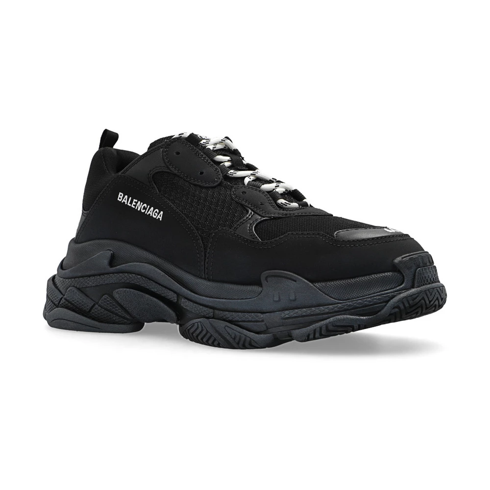Svarte ‘Triple S’ sneakers fra Balenciaga. Laget av kunstskinn, har dette snøreparet et brodert logomønster i svart, en hevet tungeapplikasjon, størrelsesbroderi foran, slitt effekt og svart gummisåle preget med et mønster.