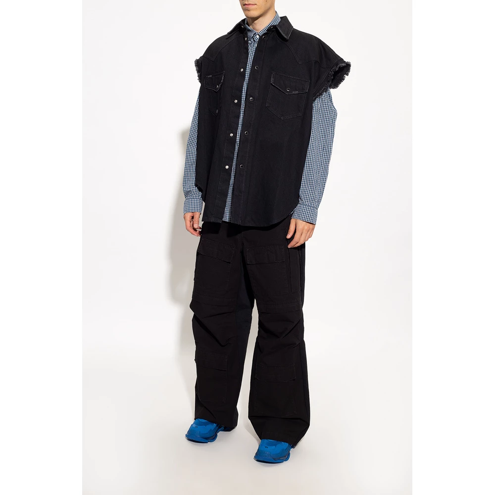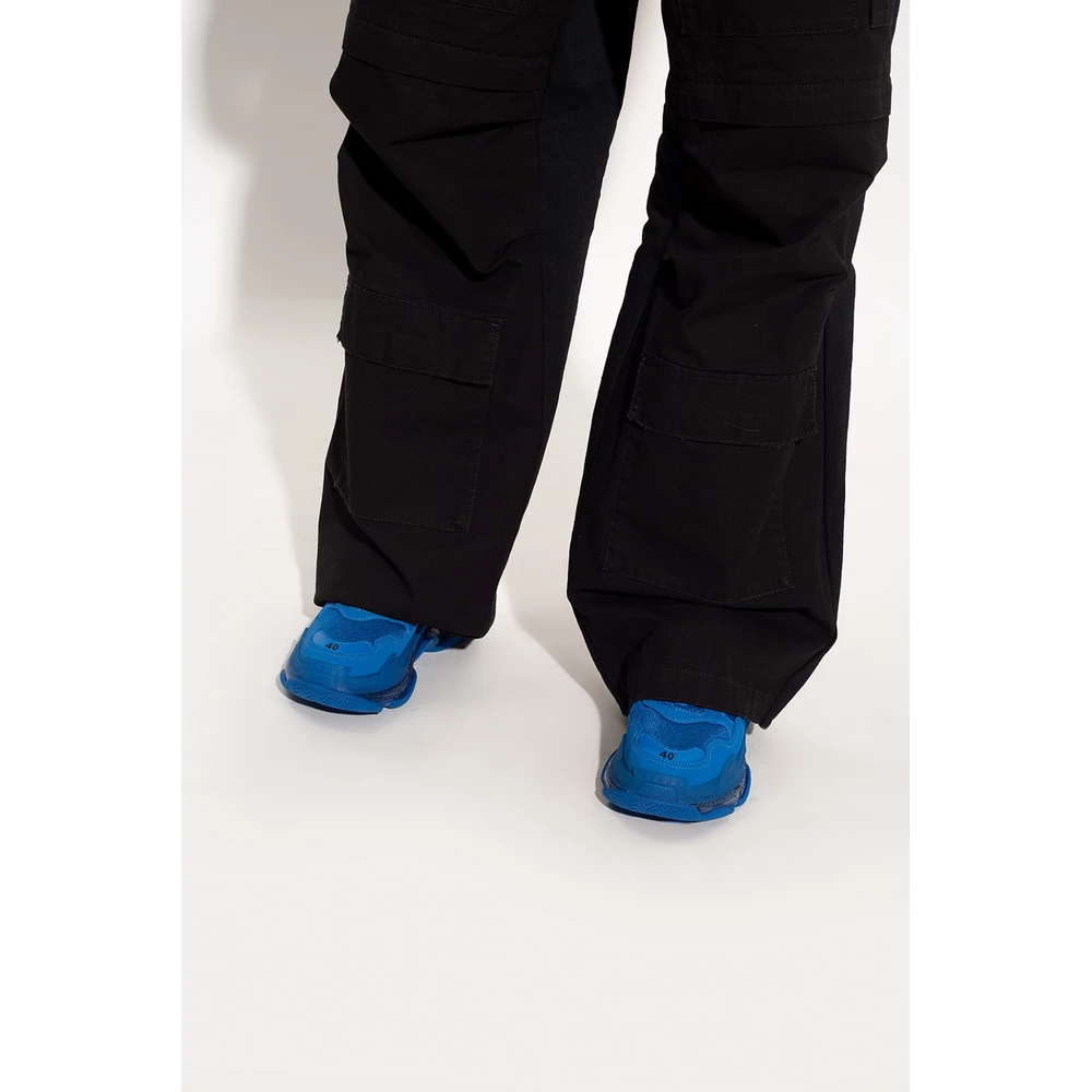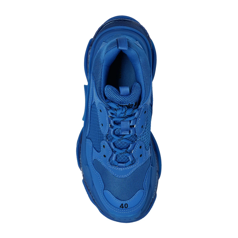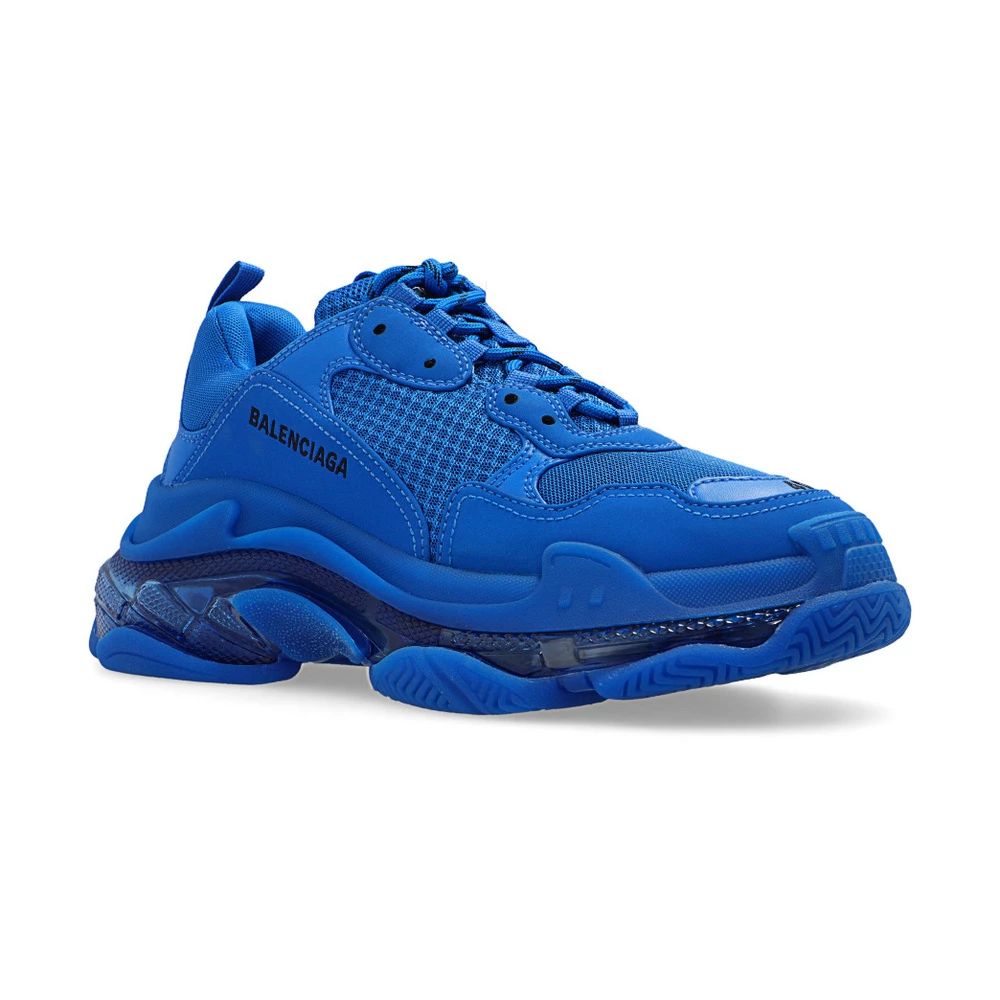 Mørkeblå ‘trippel s’ joggesko fra Balenciaga. Denne blondermodellen er laget av faux-skinn, og sitter på en mørkeblå, gjennomsiktig gummisåle og har svart logo-broderi på siden. Swappable skolisser inkludert.