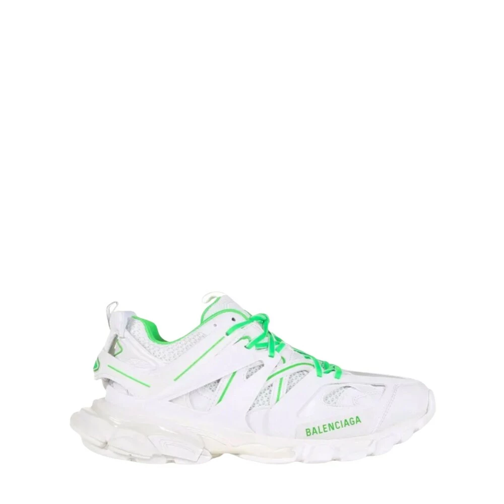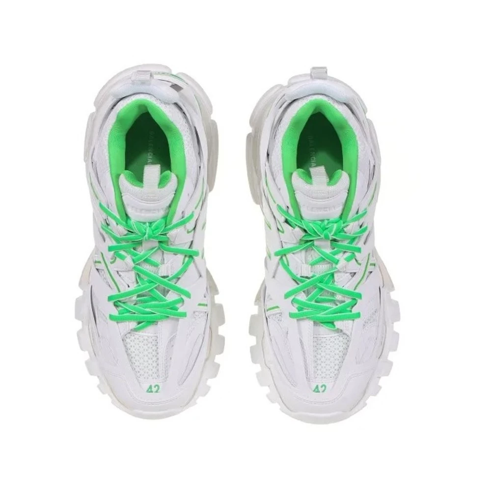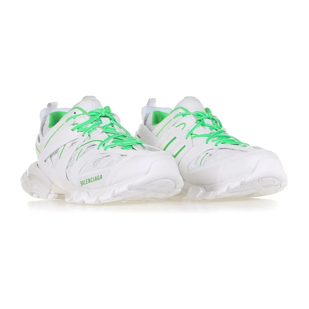 White and Neon Green ‘Track’ joggesko fra Balenciaga. Dette blonderparet er ferdig med nett, og sitter på en hvit og krem gummisåle og har en flerlags, panelet øvre med en logo-utskrift, utskjæringer og utslitte effekter.