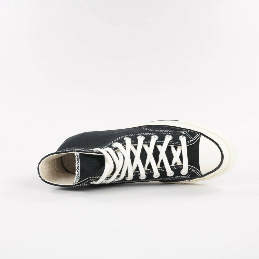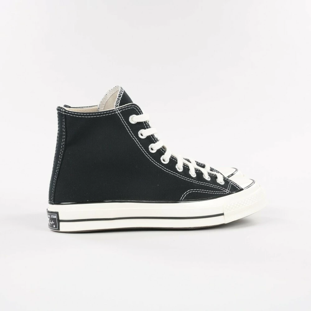 Black ‘Chuck 70 Plus’ høye top joggesko fra Converse. Dette blonderparet er laget av lerret med minst 50% resirkulert innhold, og har asymmetriske spalter, hvit logo-lapp på siden og gummisåle med en logo i hvitt, brun og beige.