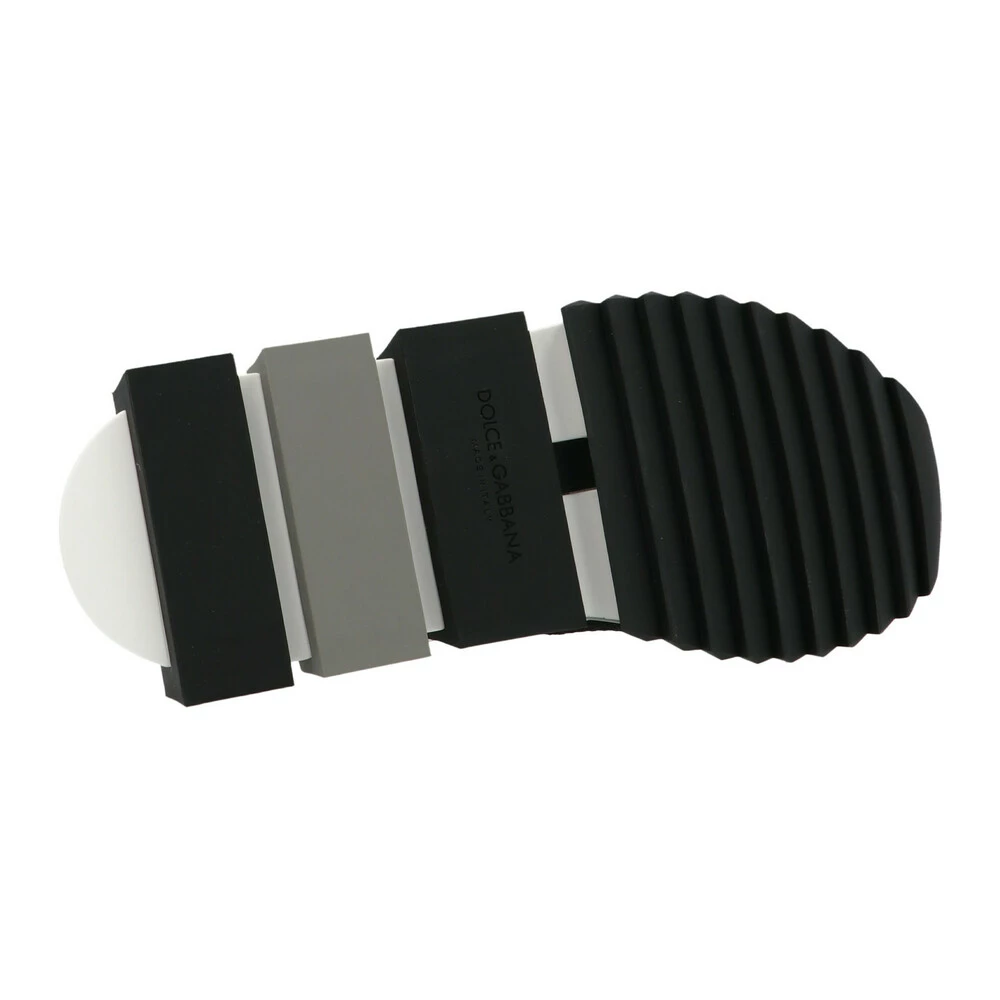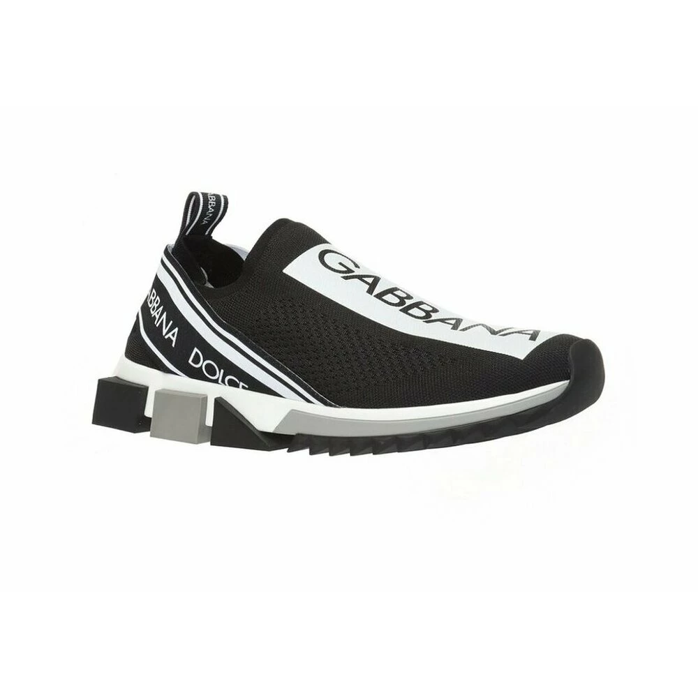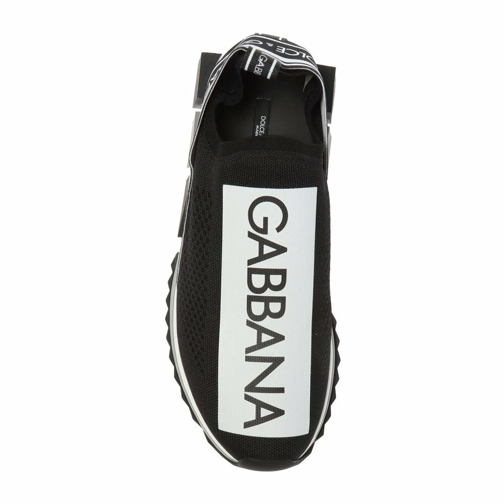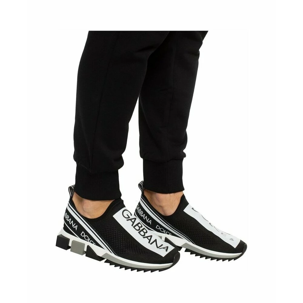 Slip-on sorte Sorrento sneakers fra Dolce ; Gabbana med logoinnsats foran, elastisk logobånd på hælen og hempe bak. Stofffôr, gummibunn, rund slepeline og kontrast dekorative grå og sorte gummiplugger.