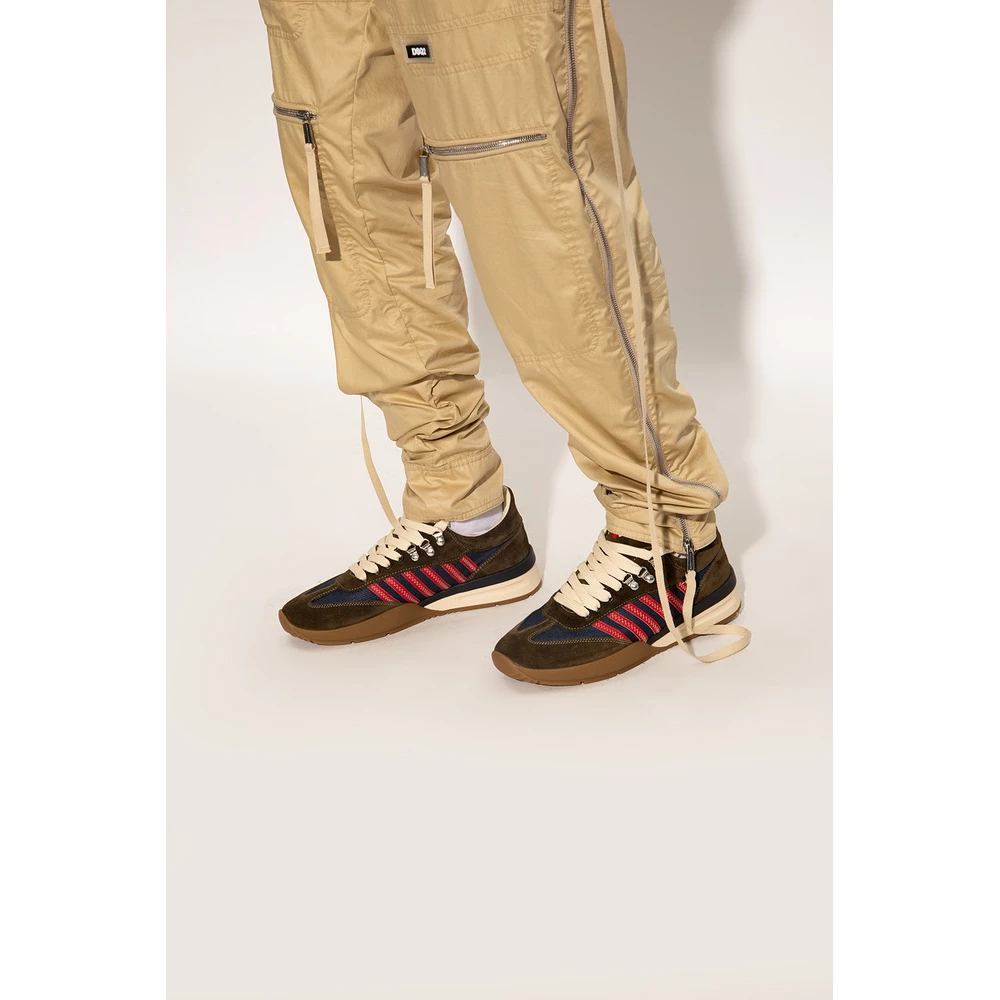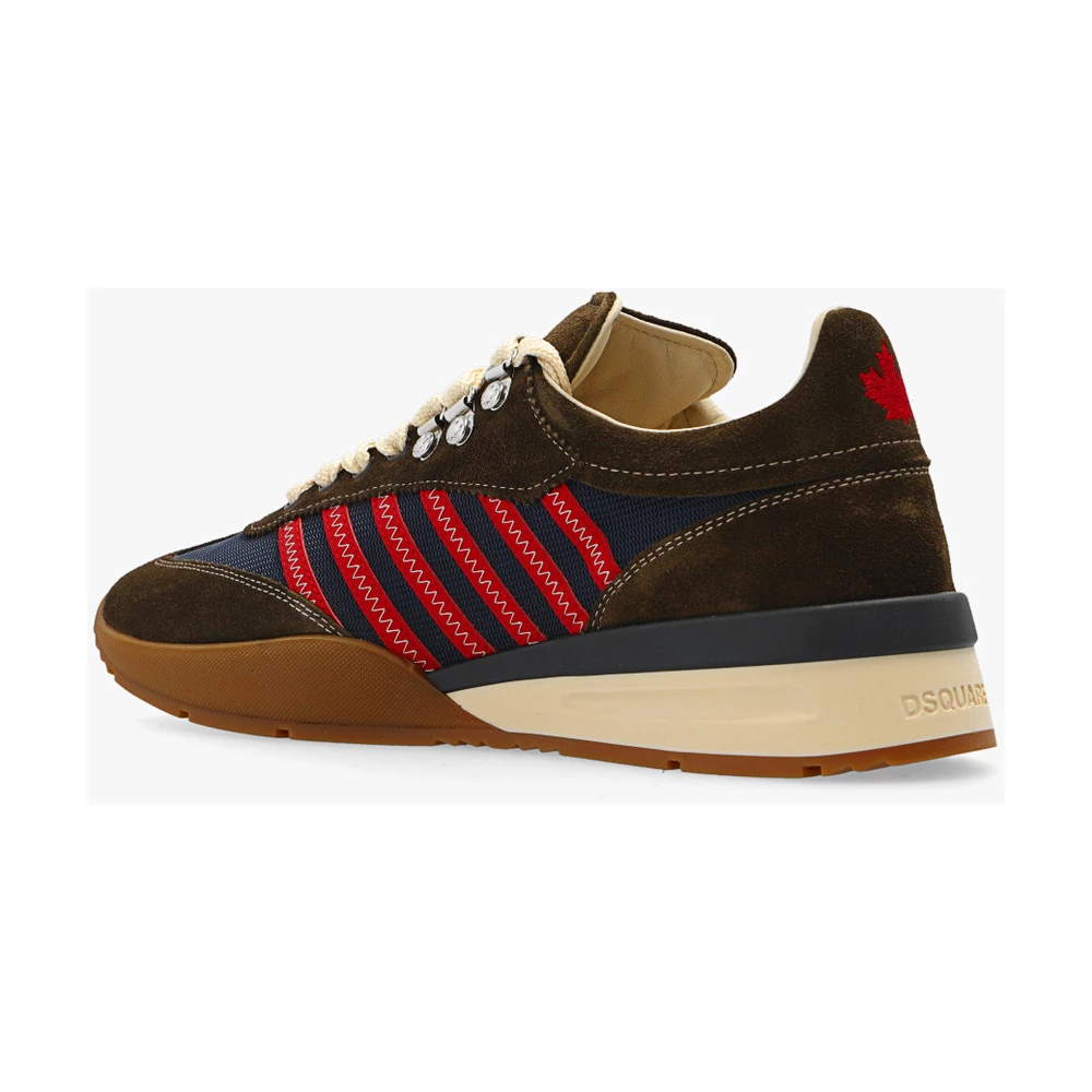 Navy Blue, Red and Dark Green ‘Original Legend’ joggesko fra DSquared2. Denne blondermodellen er laget av semsket skinn og sitter på en brun gummisåle og har stofftrimmer og en trykt og brodert logo i hvitt og rødt.