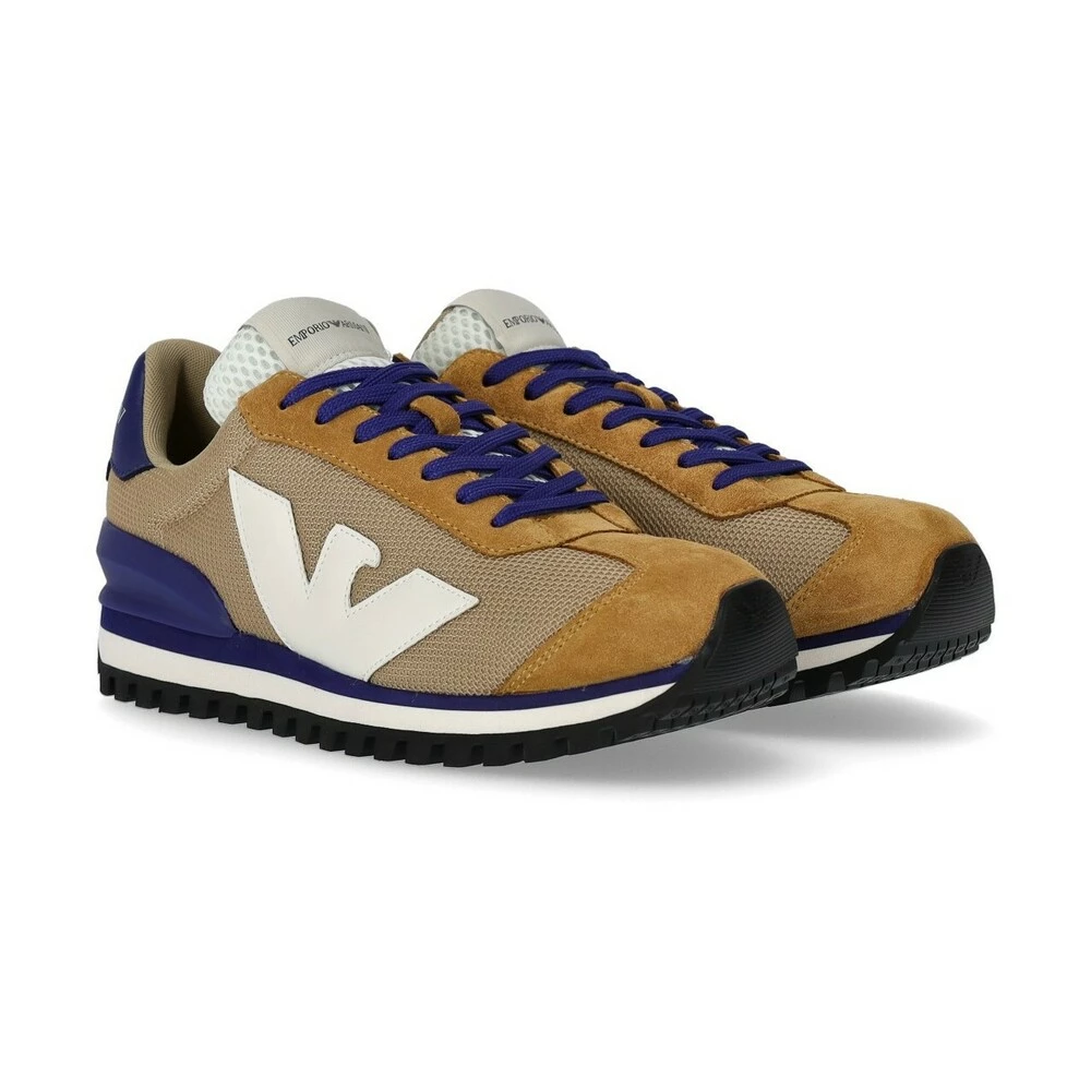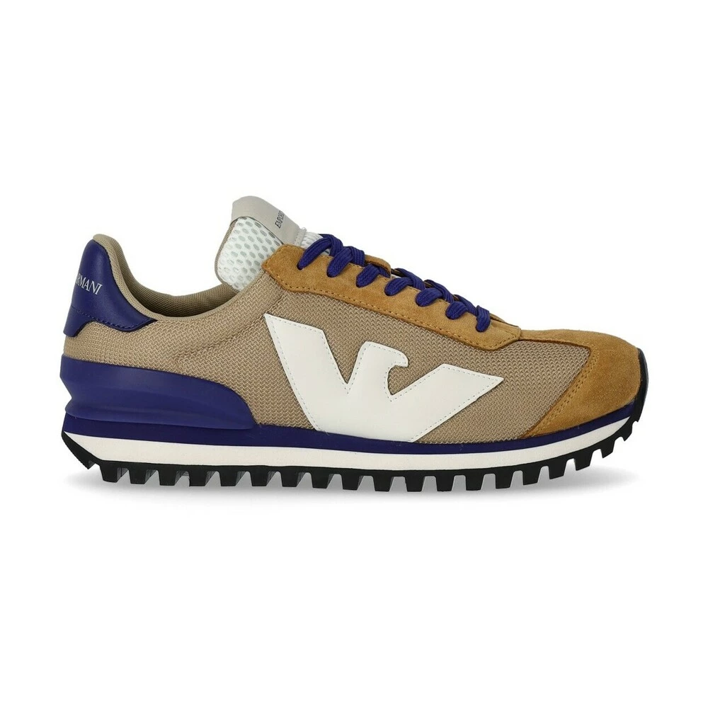 Emporio Armani sneaker laget av nett og semsket skinn i nyanser av beige og hvitt, med kontrasterende blå skinninnsatser. Logo sydd på siden, bomullsspiller og tricolor sklisikre gummisåle. Høyde 3,5 cm.