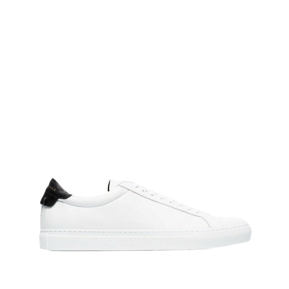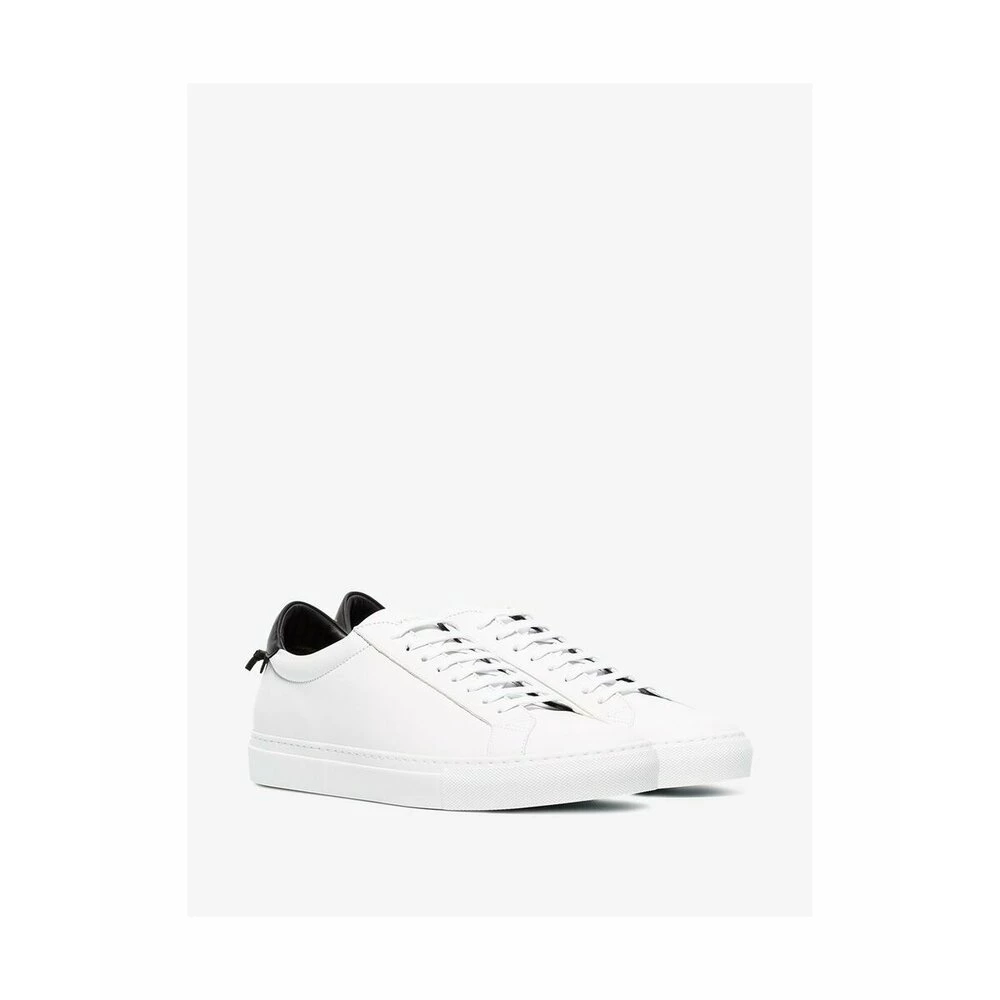 Givenchy Urban Gate hvite sneakers i glatt, matt skinn lav topp og blonder nedleggelse. Kontrastfarget svart hælkrave med gull metallisk logo, to dekorative liten knute detalj på hælen, hvite gummisåle. Svart skinn innersåle.