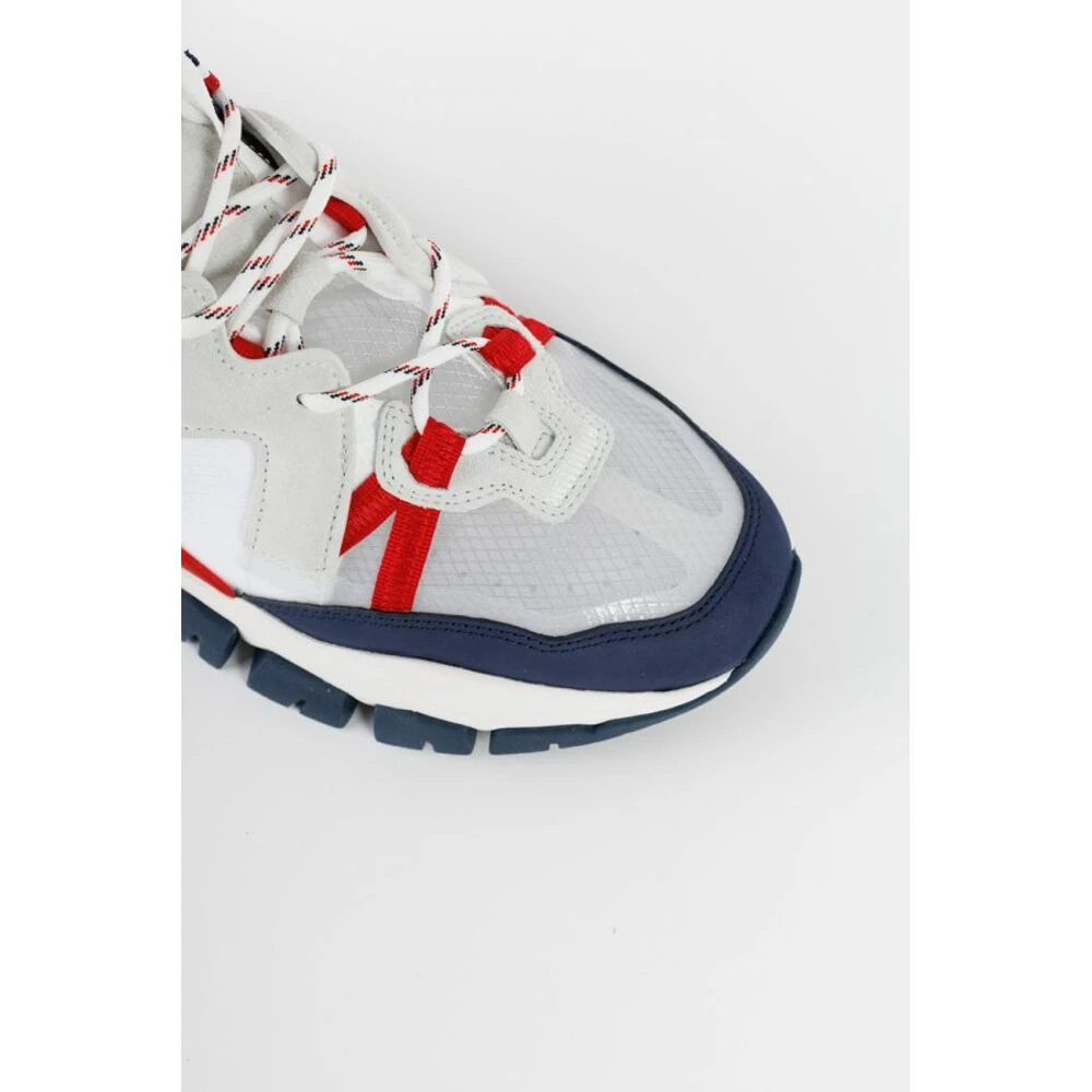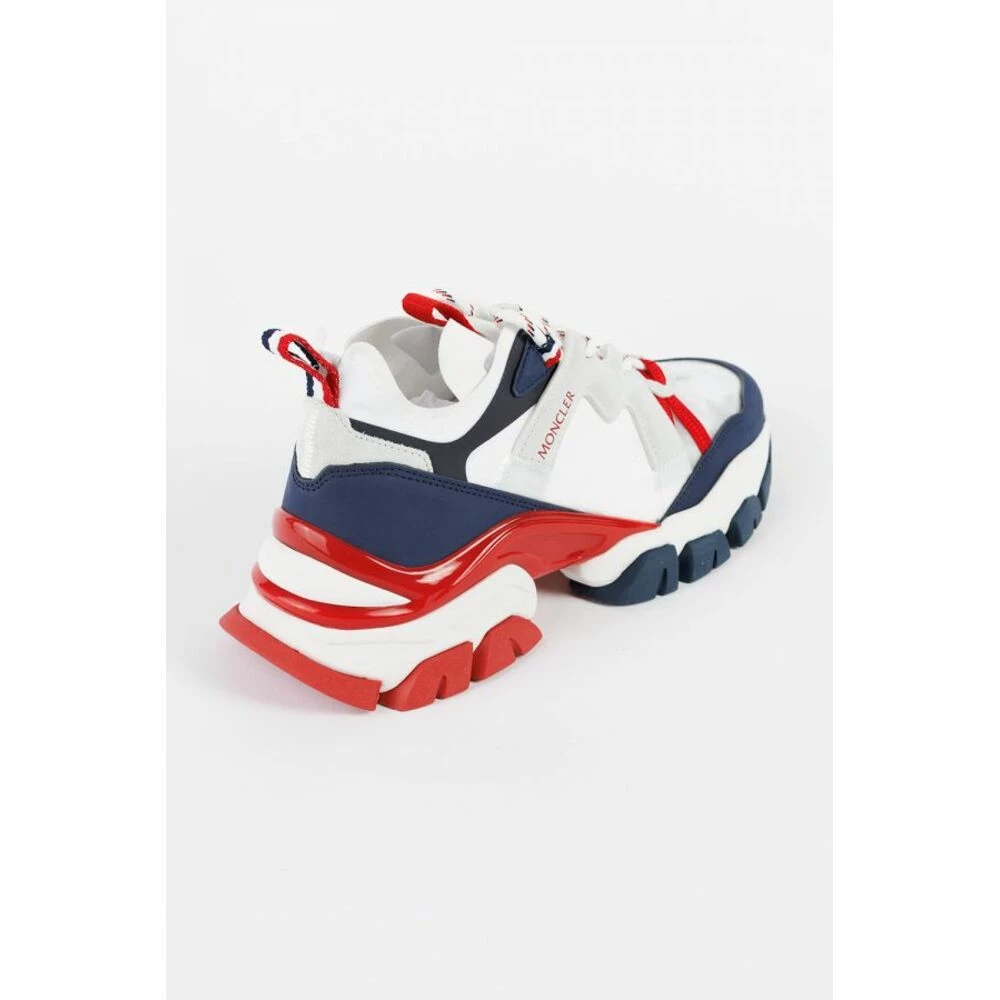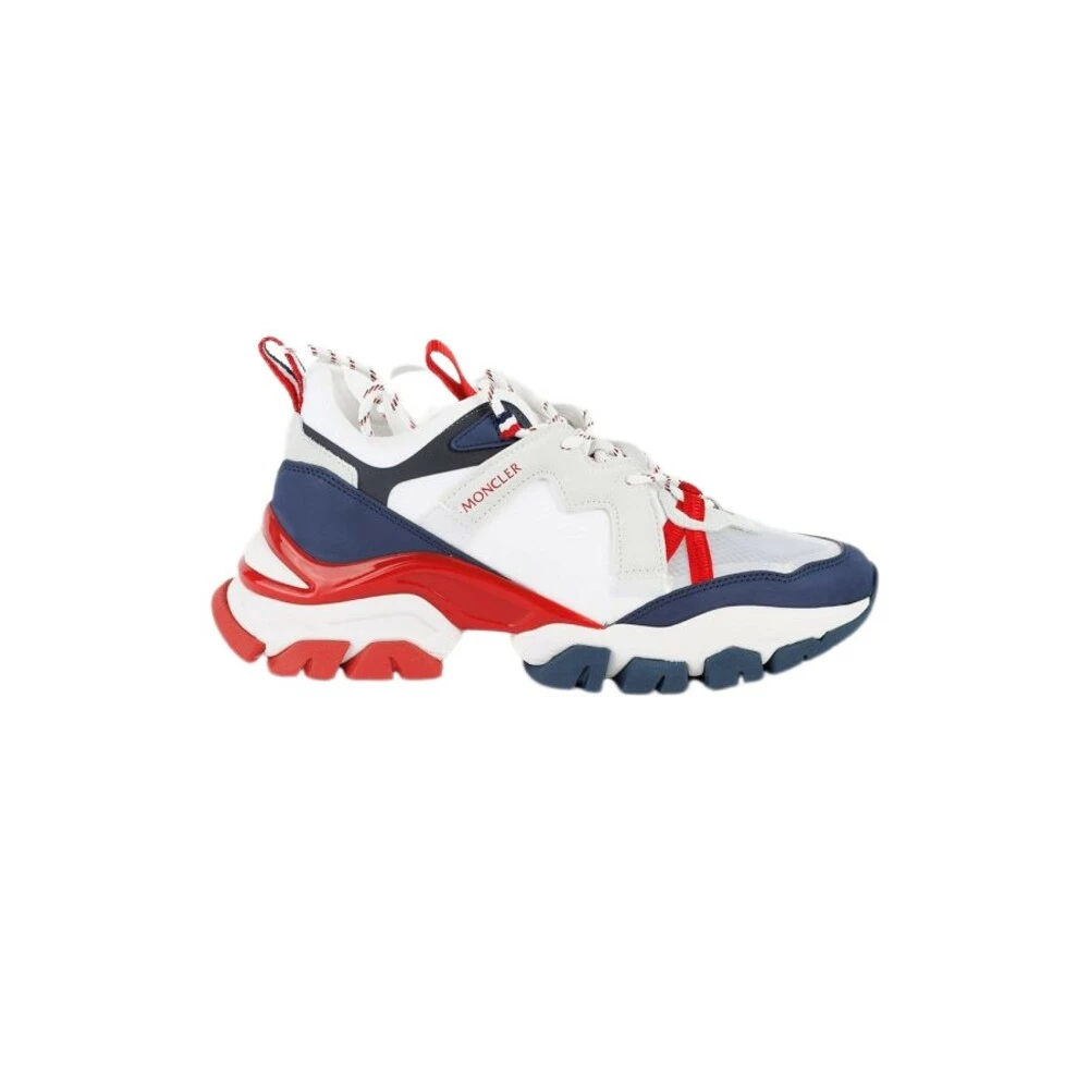 Hvit, marineblå og rød ‘la ingen spor’ joggesko fra Moncler. Denne blondermodellen sitter på en rød, marineblå og hvit gummisåle, og har semsket skinn, et gjennomsiktig innsats på fronten og merkets logo trykt på siden.