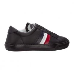 Svarte New Monaco Moncler lave sneakers laget av skinn, med gummisåle. Joggeskoene er snøret og har tre striper i hvitt, rødt og marineblått.