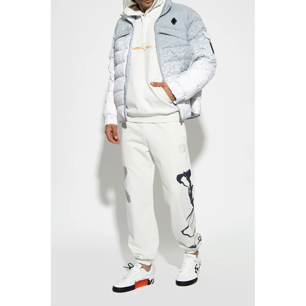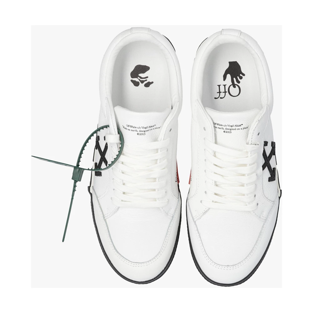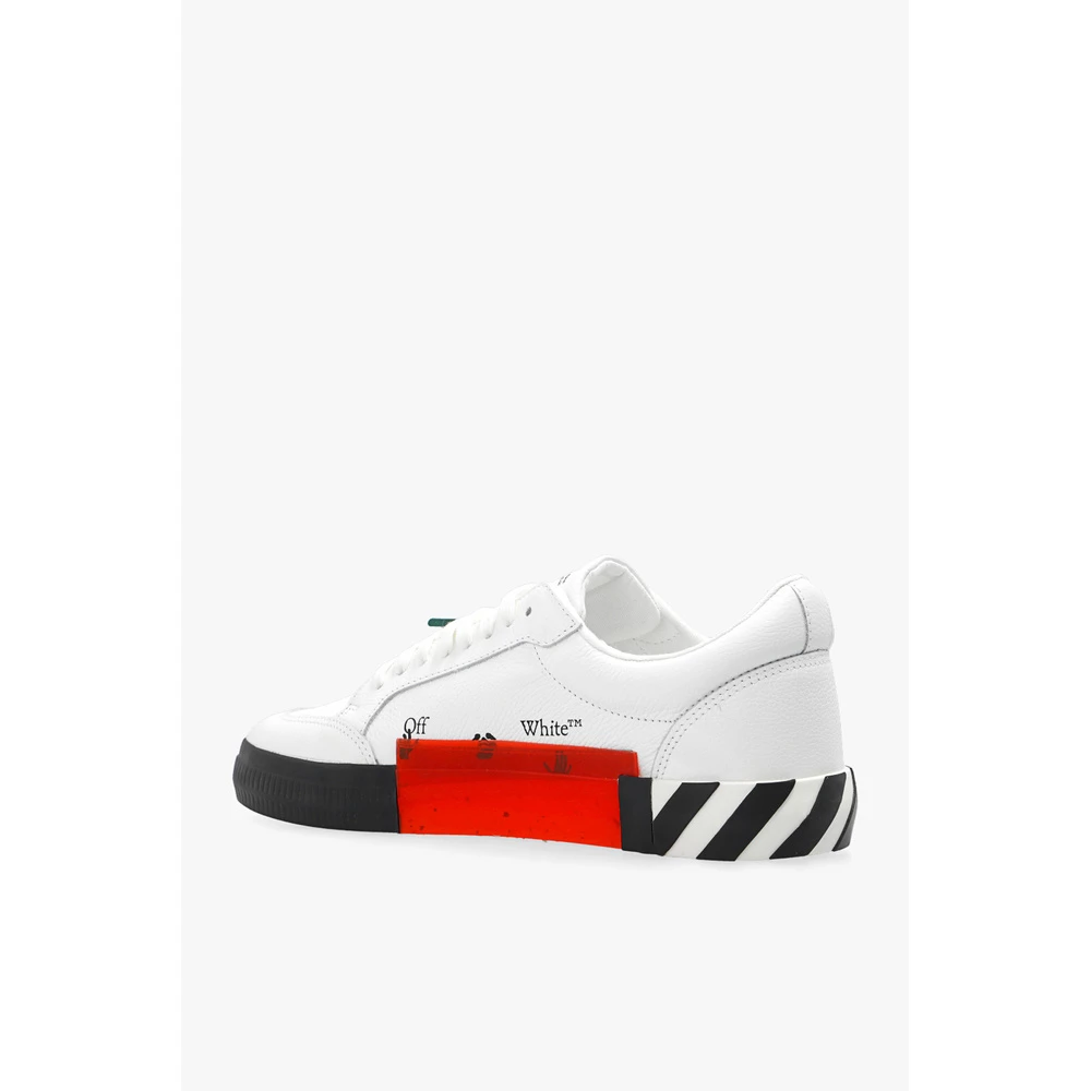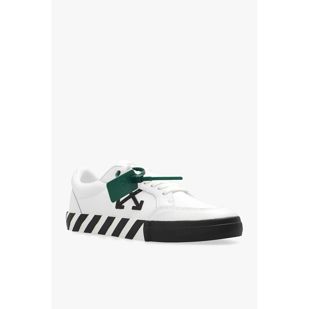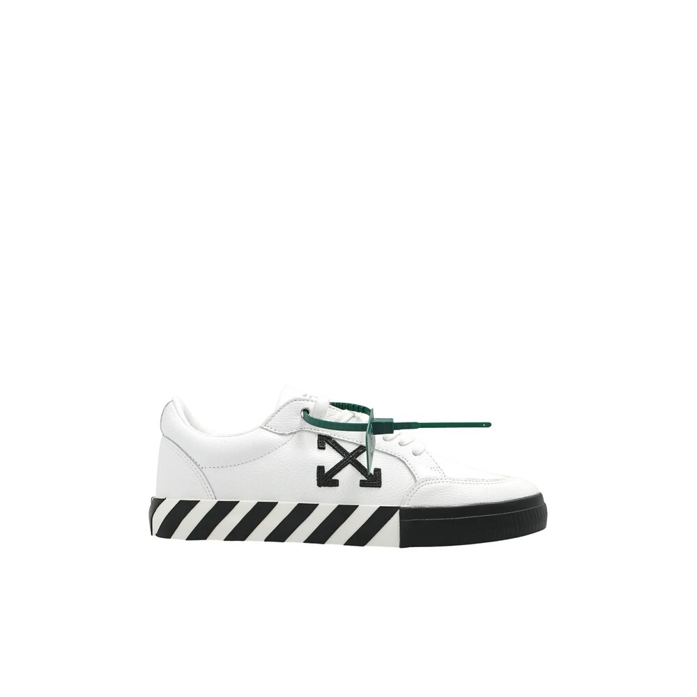 Hvite og svarte ‘lave vulkaniserte’ joggesko fra off-white. Dette blonderparet er laget av skinn, og inneholder logotrykk, piler, etikettens signatur glidelås i mørkegrønn, så vel som en hvit og svart såle med et gjennomsiktig innsats i oransje og hevet stripemønster.