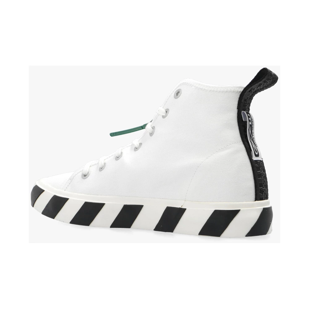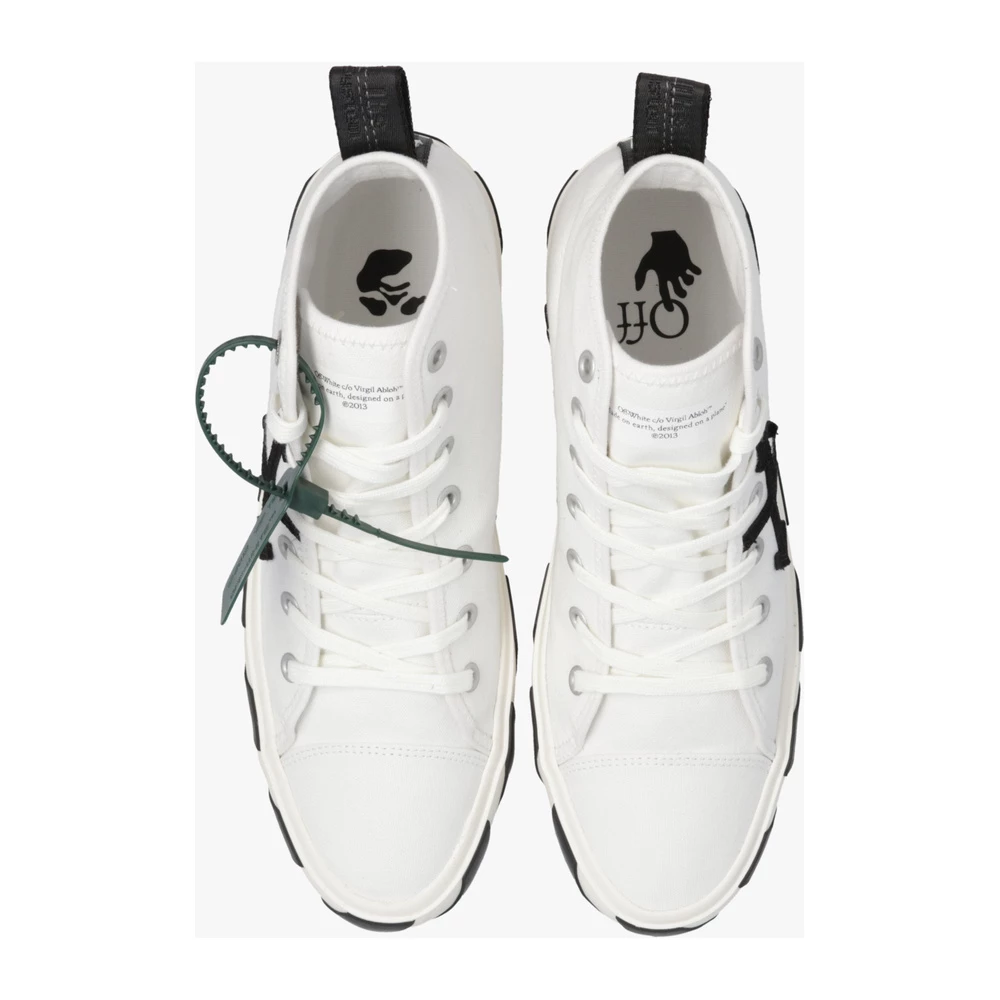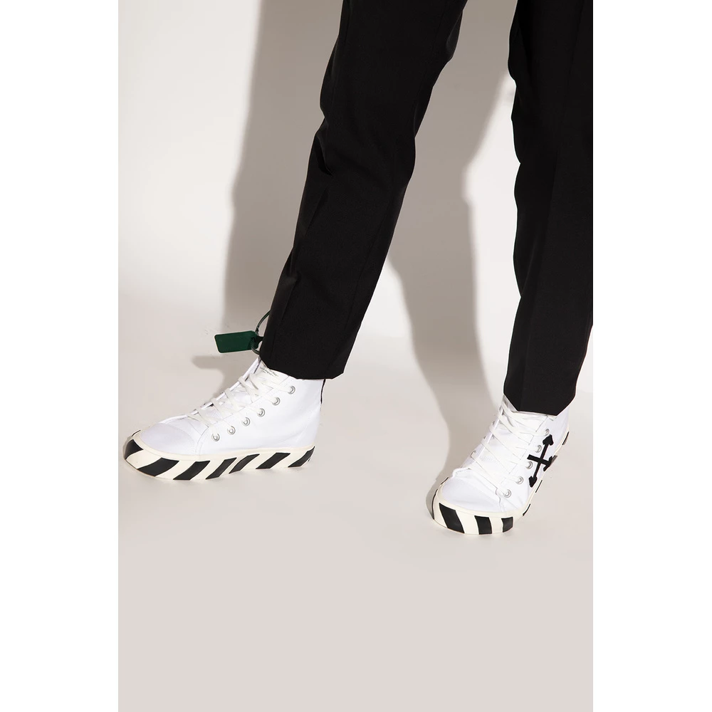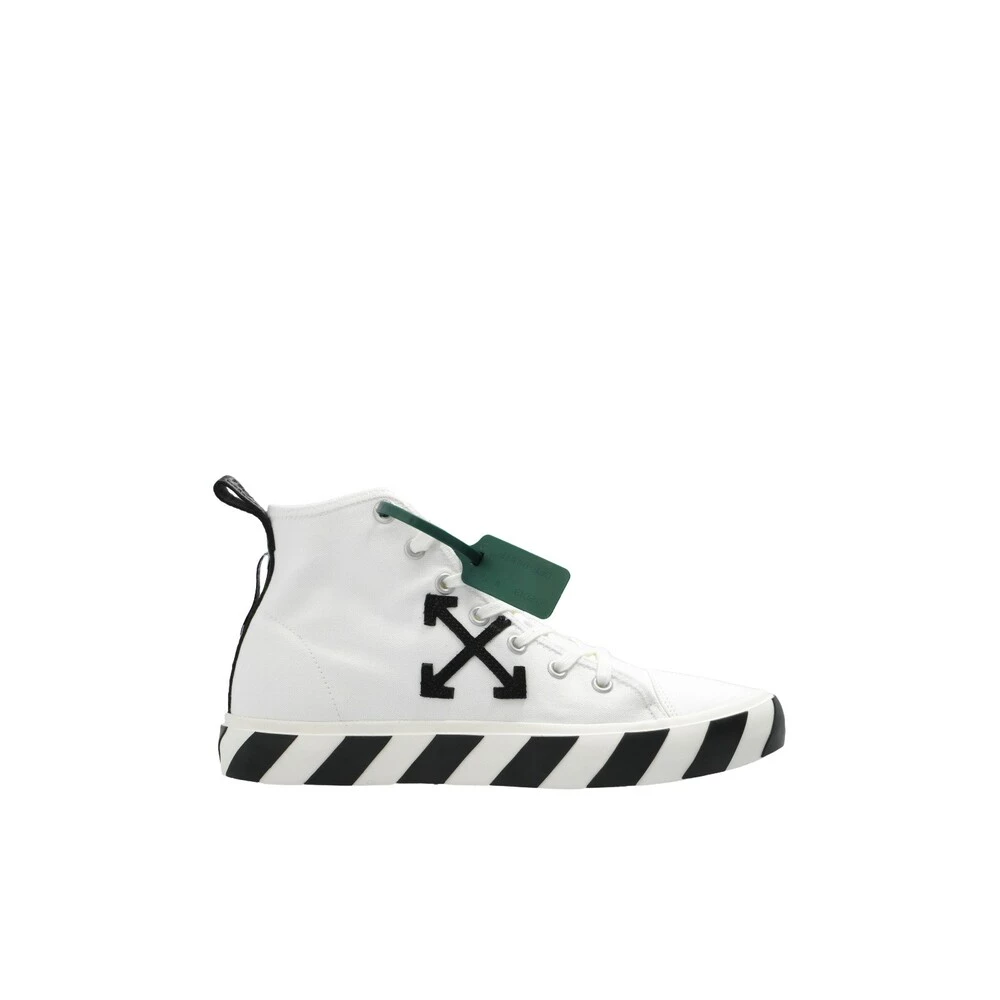 Svart og hvitt ‘midt topp vulkanisert’ høye top joggesko fra off-white. Laget av lerret. Dette blonderparet hviler på en hvit og svart gummisåle med et hevet stripe-mønster, og har en logo som er trykt på tungen, Arrows-lappen, grosgrain pull stropp brodert med et mønster og etikettens signatur glidelås i mørkegrønn.