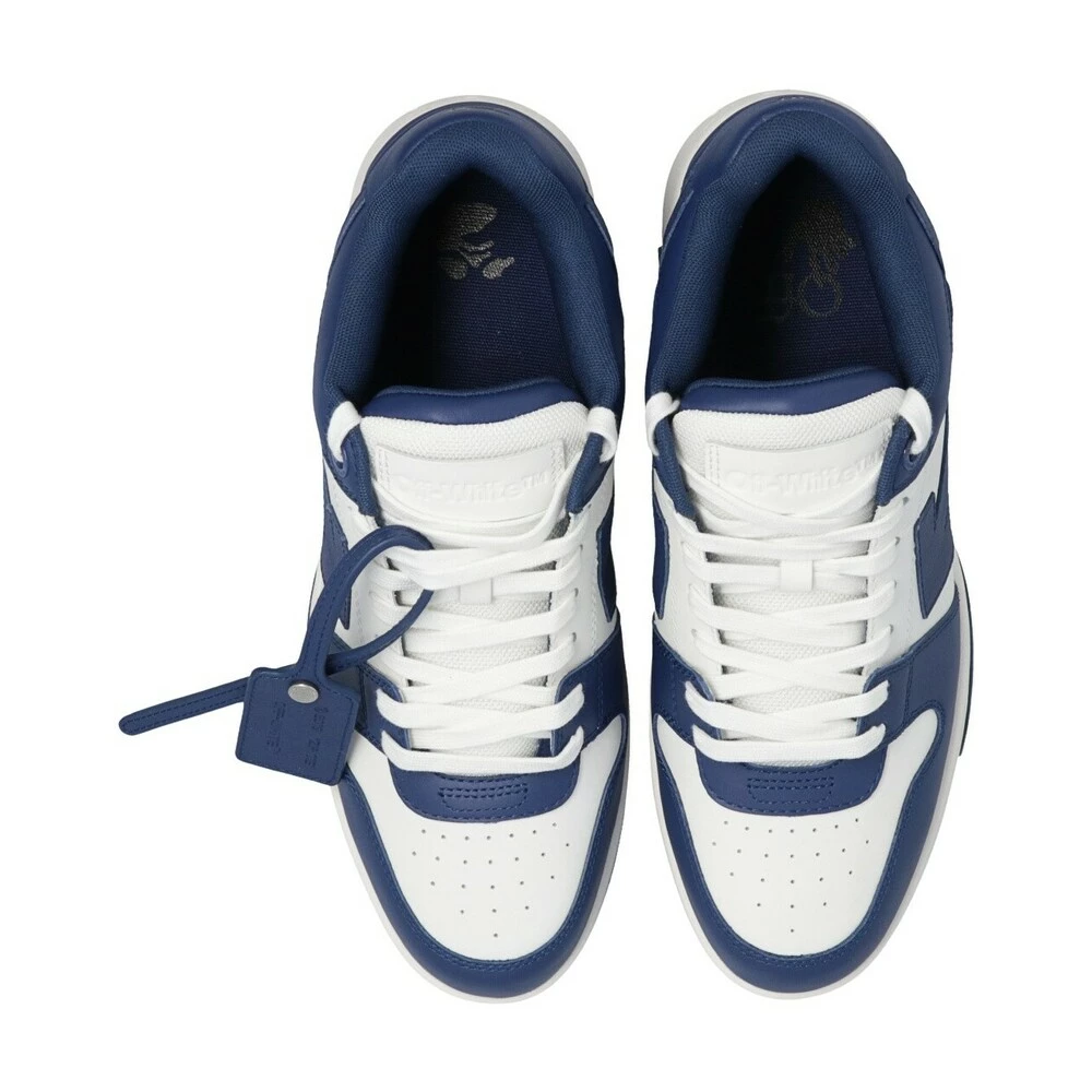 White and Navy ‘Out of Office’ joggesko fra off-white. Dette blonderparet er laget av skinn, og har en Arrows-lapp, brunt trykk, perforeringer, merkets signatur glidelås i marine og gummisåle i hvitt og marine.