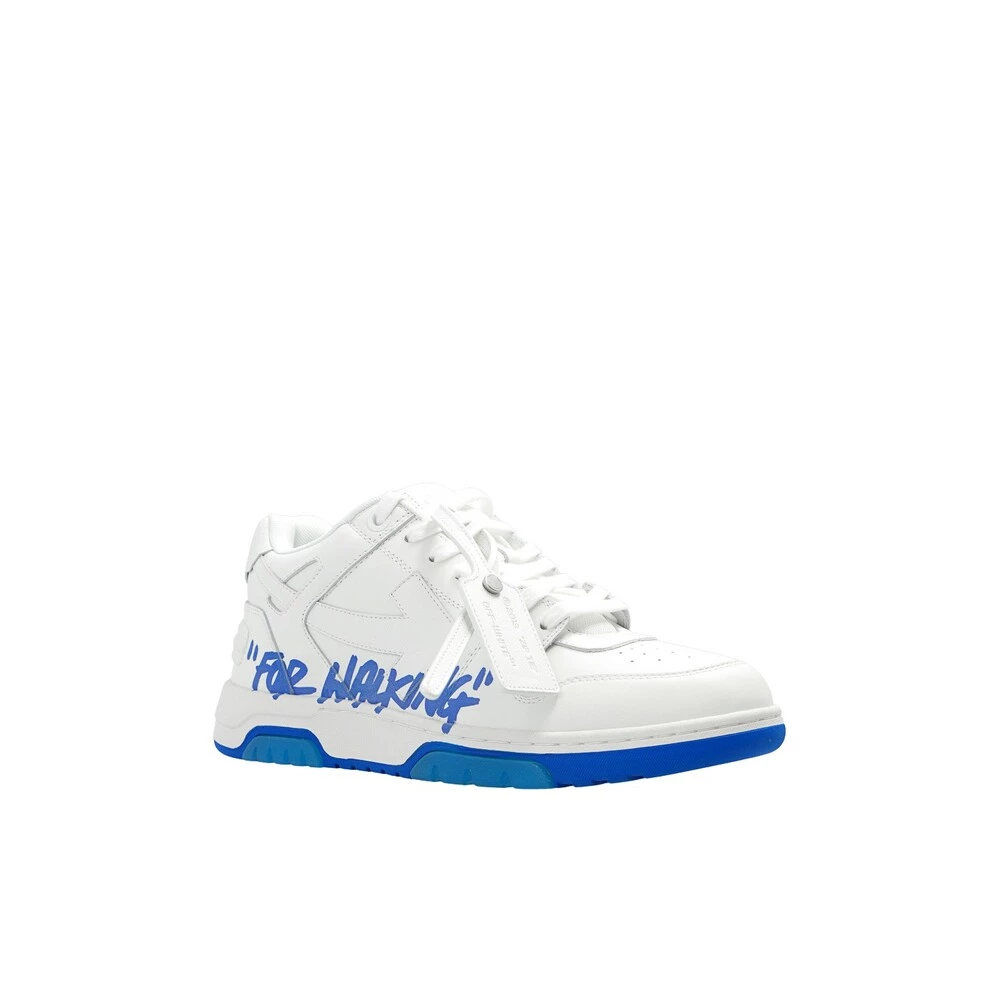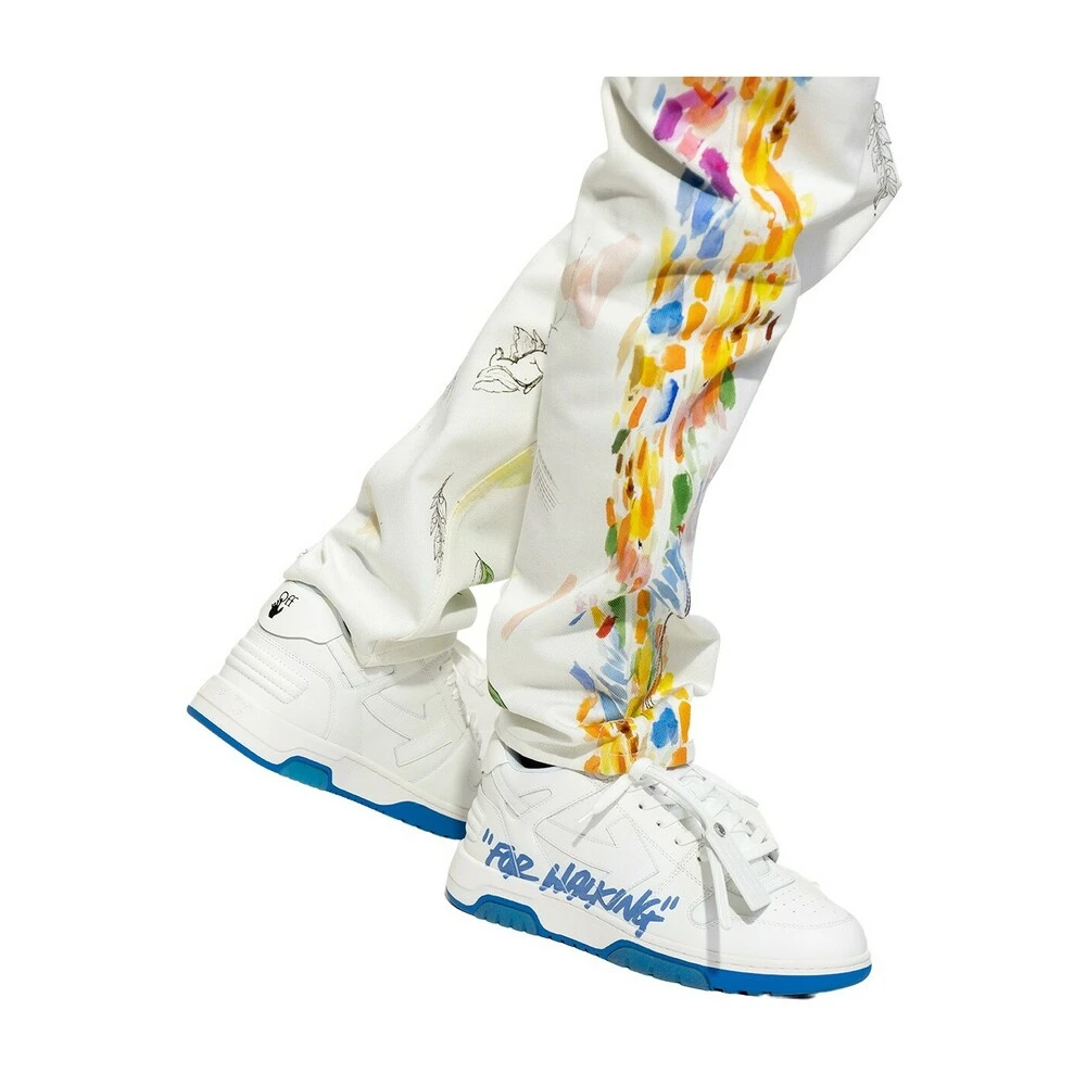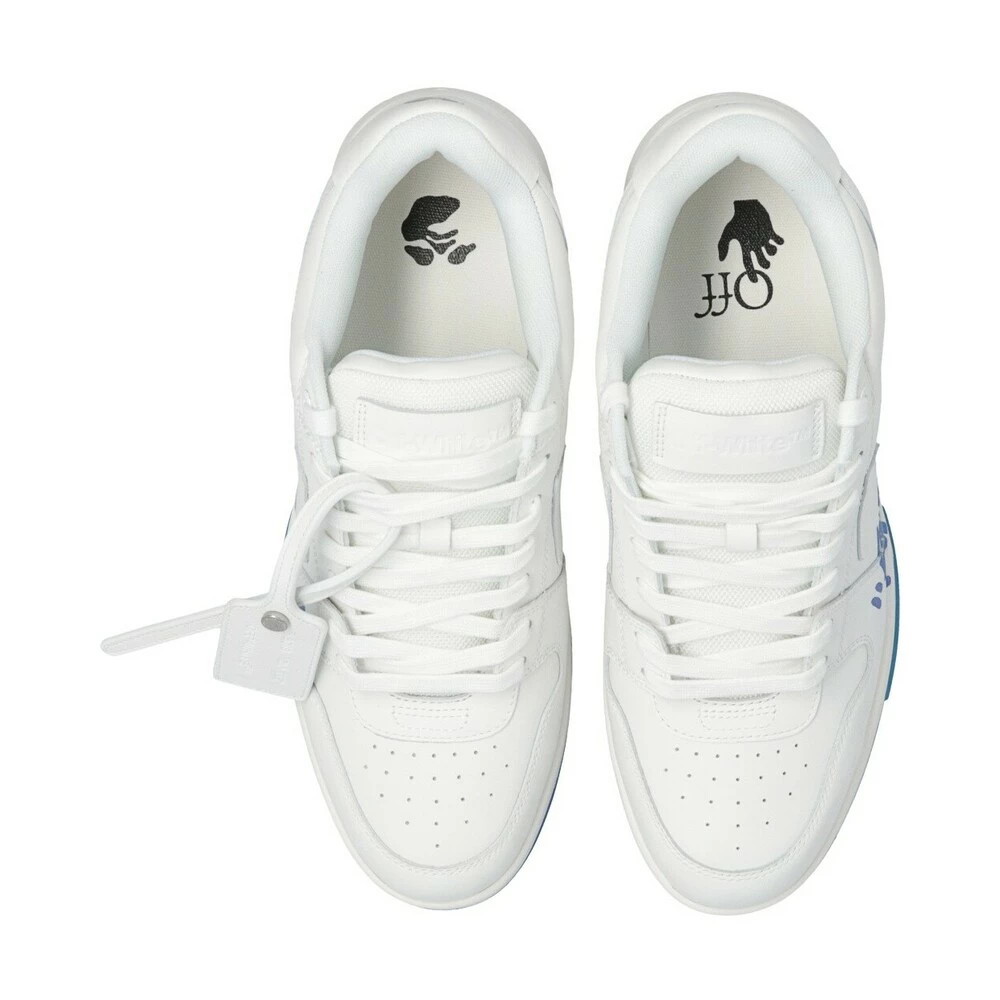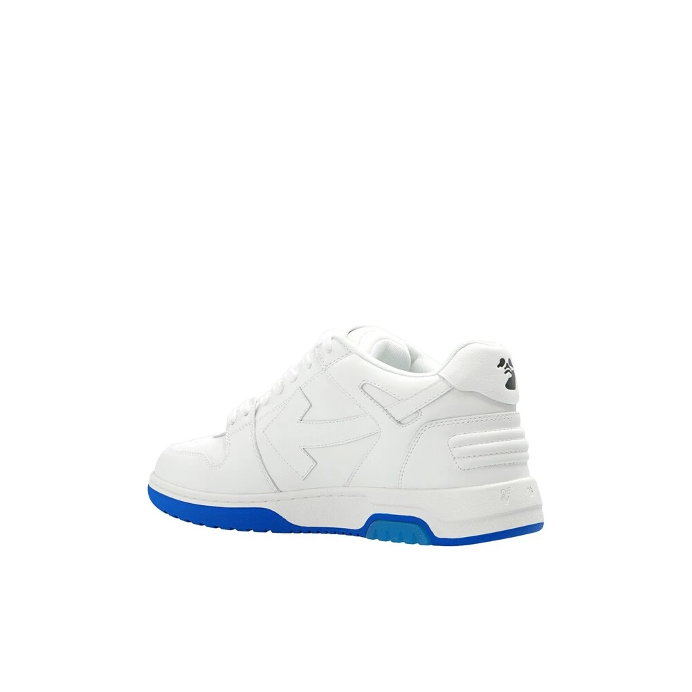 Hvite ‘ut av kontoret’ joggesko fra off-white. Dette blonderparet er laget av skinn, og har et pilmotiv, blått trykk, perforeringer, merkets signatur zip tie i hvit og gummisåle i hvitt og blått.