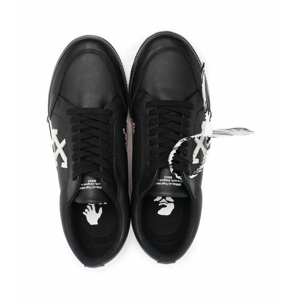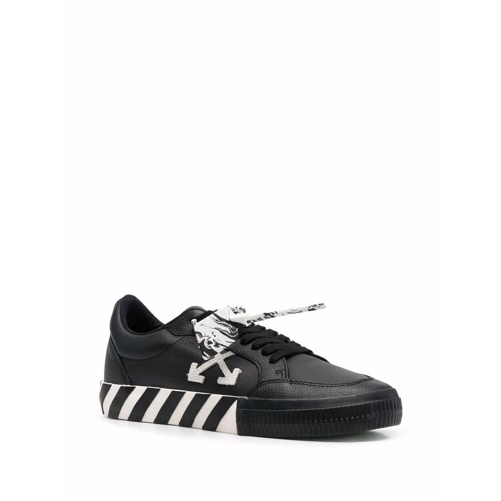 Av hvite joggesko svart skinn lave vulcaniserte joggesko fra off-white med signaturpilmotiv, signatur zip tie-tag, rund tå, frontfjæring foran og flat gummisåle.