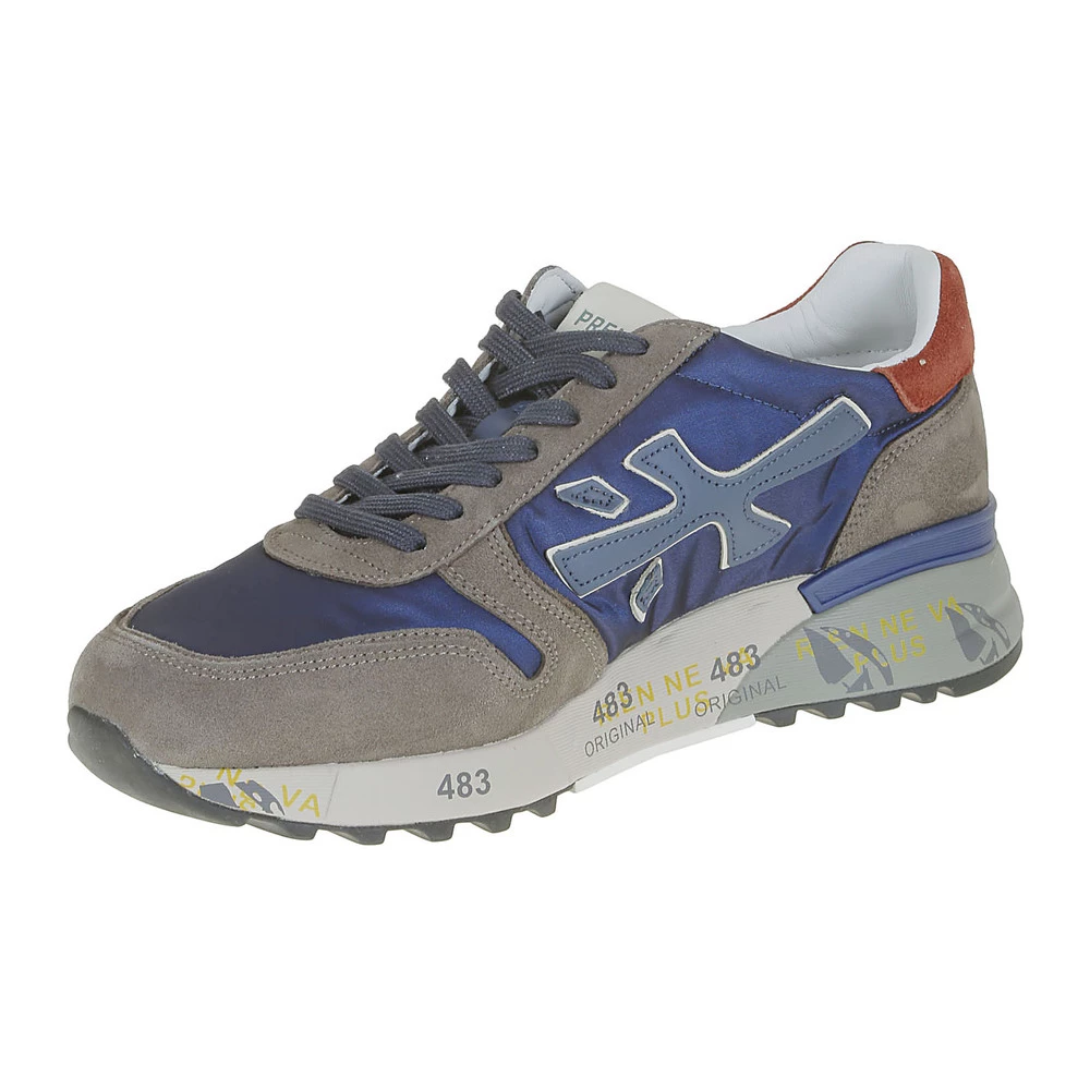 Premiata sneaker i nylon og blå og grå, oransje semsket skinn på baksiden, gummisåle med utskriftsdetaljer, sidelogo detalj.
