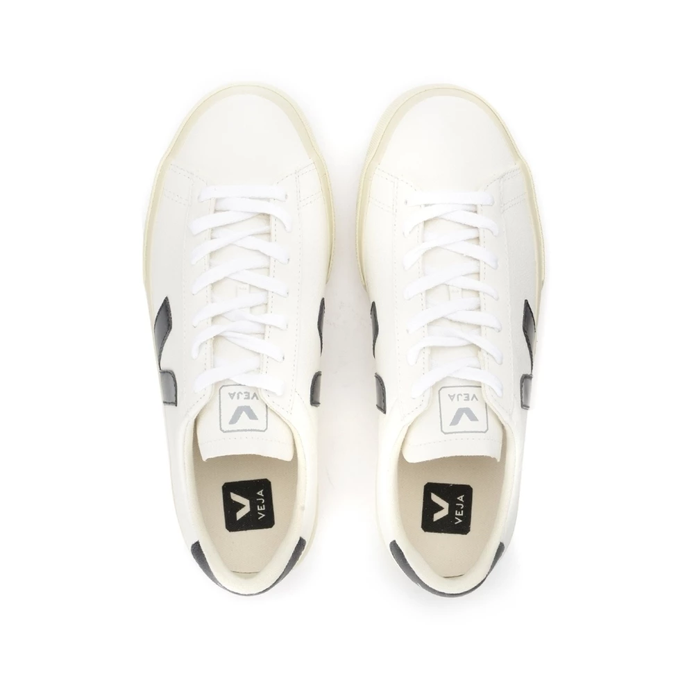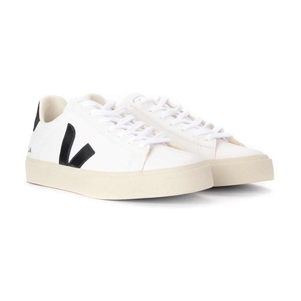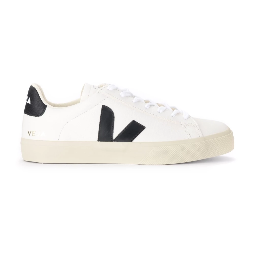 Skinn joggesko lave sko med V på siden og metallisk merkenavn skrives ut. Matchende blonder.
