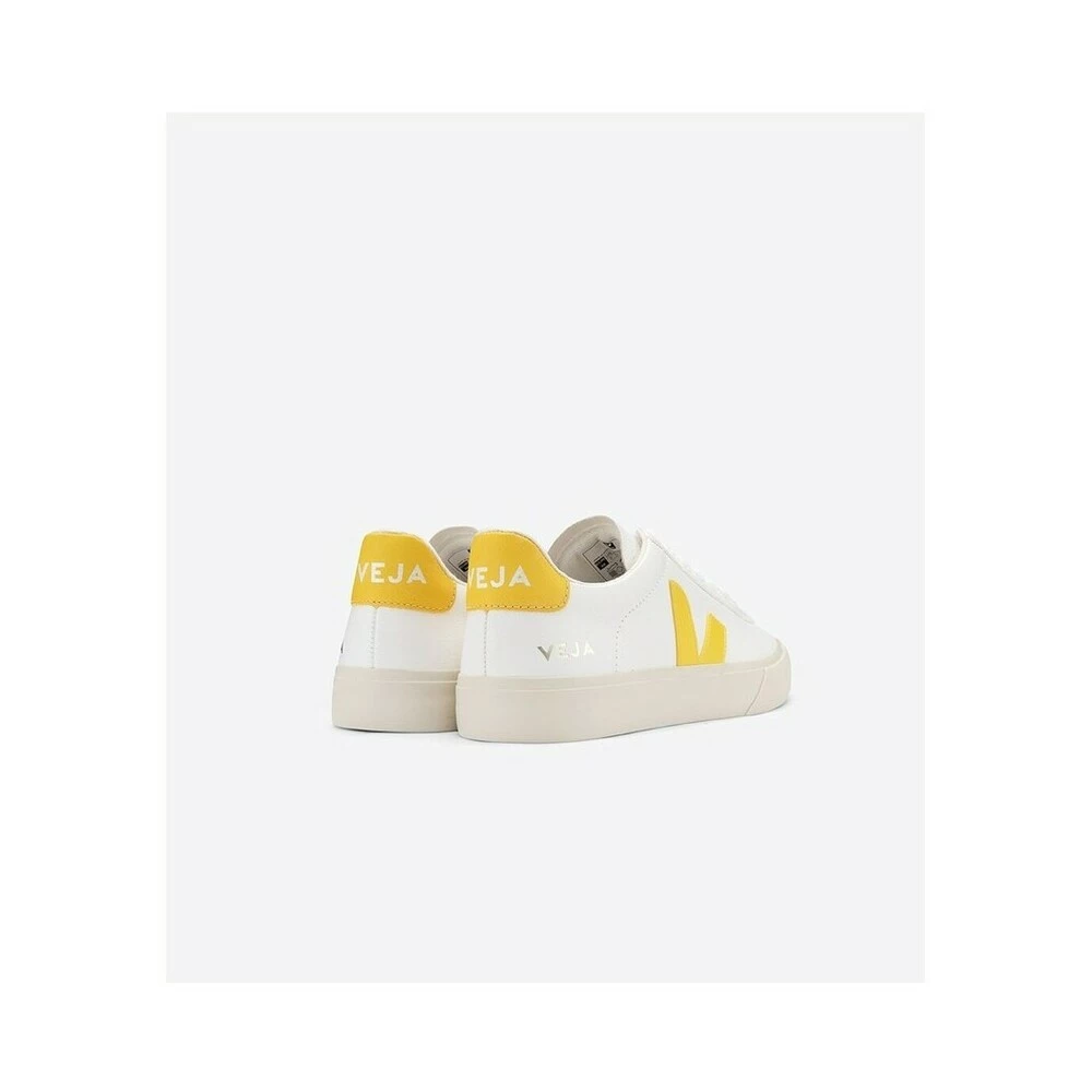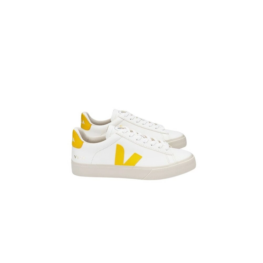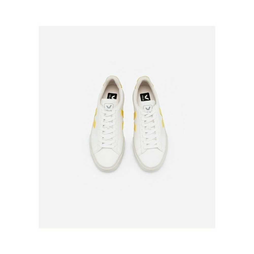 Campo sneakers fra Veja. Skinn, hvite joggesko med solfylte gule detaljer. Egenskaper fremre snøre feste i hvit, rund tå og flat gummisåle. Dekorert med gul logo lapp på sidene, kontrasterende gul hælkappe, logo-preget tungen, branded innersåle.
