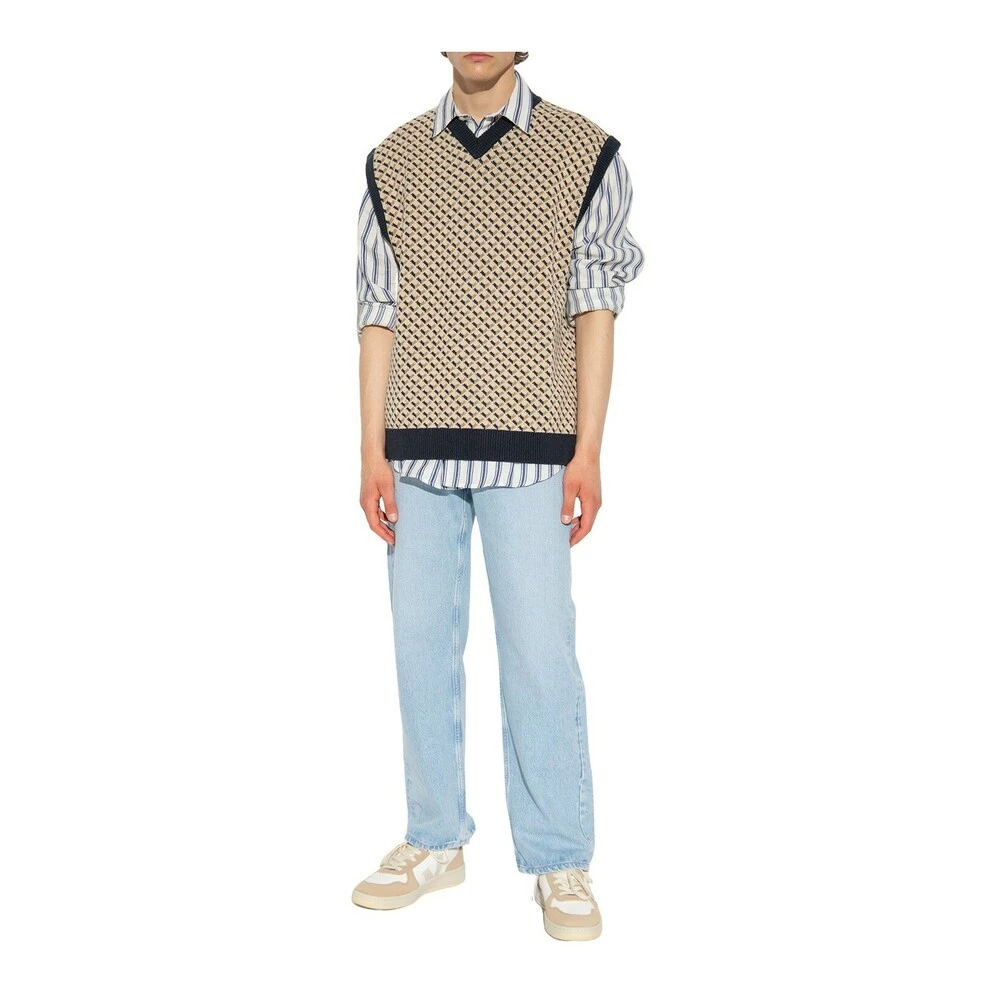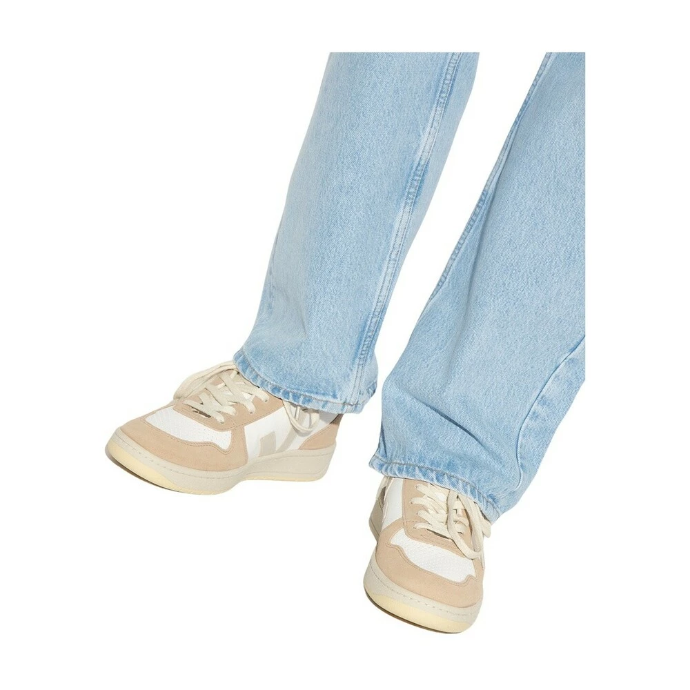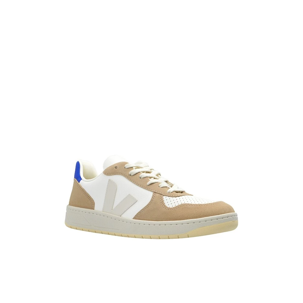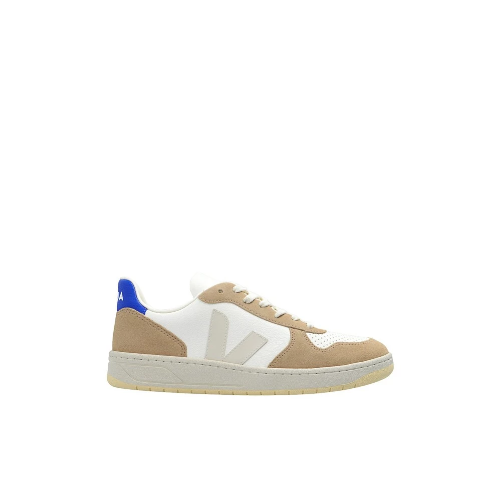 Hvite og beige `V-10 skinn` joggesko fra Veja. Denne snøremodellen er laget av skinn, og har en preget logo på tungen, en signaturkremlogo-lapp i gummi og risavfall, en perforert tå, organisk bomullssko og en blå innsats bak. Nettingens indre fôr laget av resirkulerte materialer ble utviklet for å få bedre motstand mot friksjon. Den organiske hentet og resirkulerte innersålen består av sukkerrør, Amazon-gummi, organisk bomull og resirkulert EVA. Den er satt på en krem gummisåle laget av organiske og resirkulerte materialer. Skinnet kommer fra gårder i Rio Grande do Sul og er L.W.G. Gull som er sertifisert av skinnarbeidsgruppen, som fremmer bærekraftig praksis som har en positiv innvirkning på miljøet i garverier.