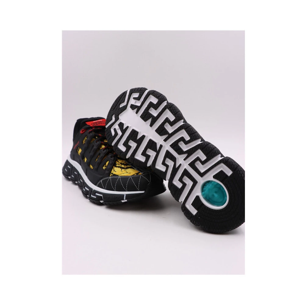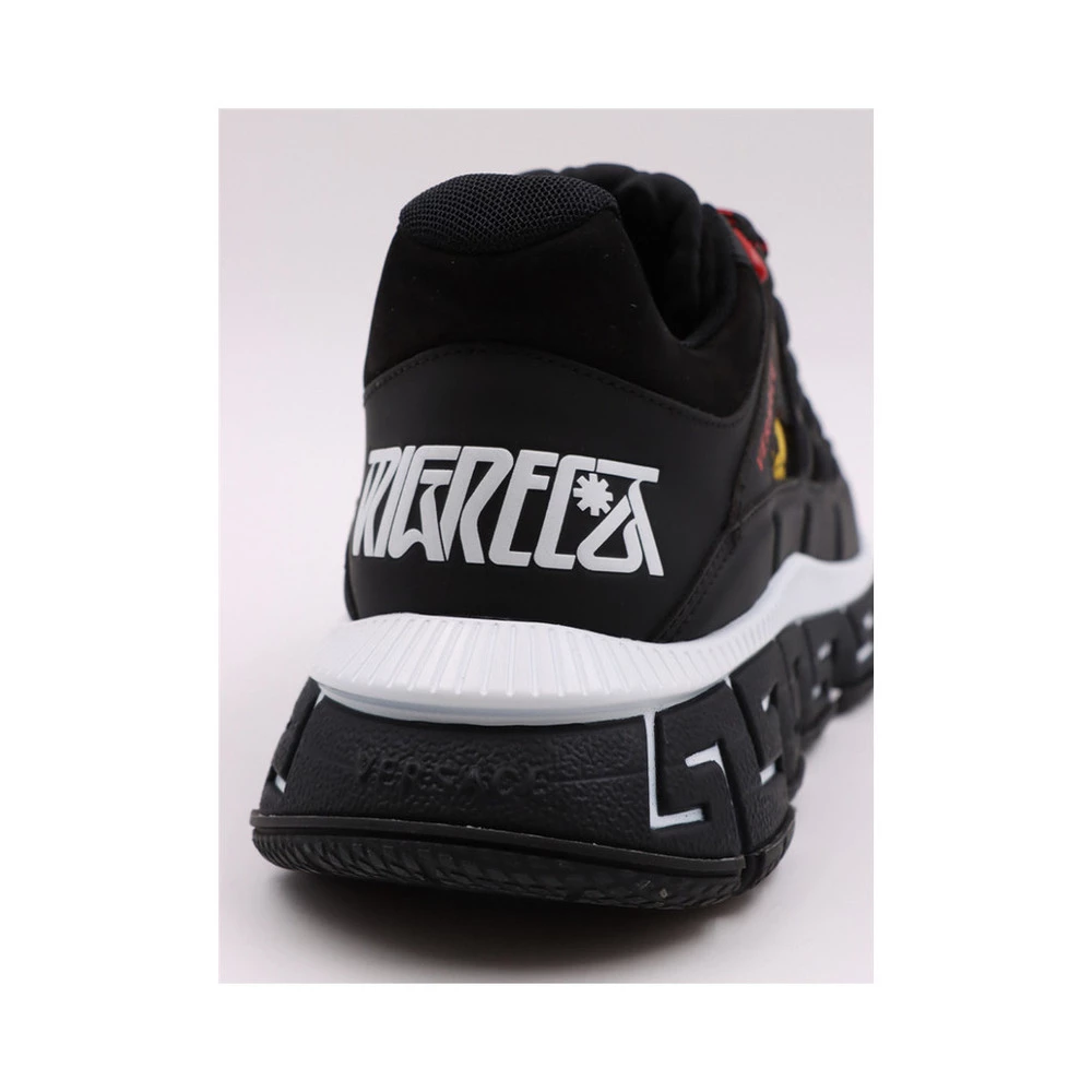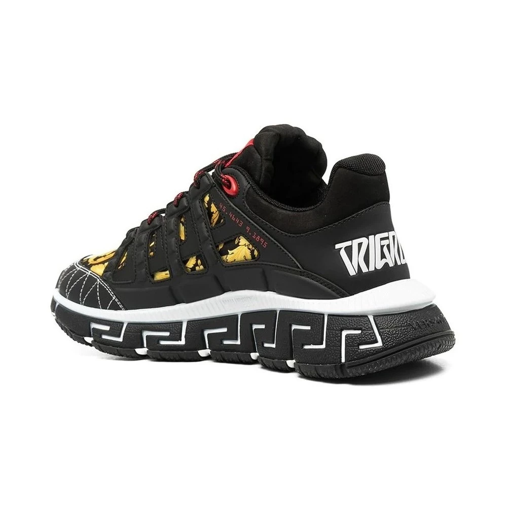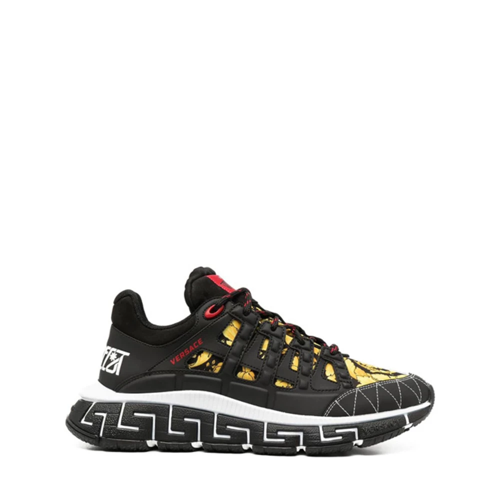 Trigreca trenere av versace. Svarte lave topp snørebånd Sneakers i Barocco Print med overdimensjonert såle. Ny estetikk i design har resultert i denne moderne fargerike modellen med Tregraca-bokstaver på tungen og hælen. Greca på sålen og forsiden av skoen. Trykte koordinater til Milano.